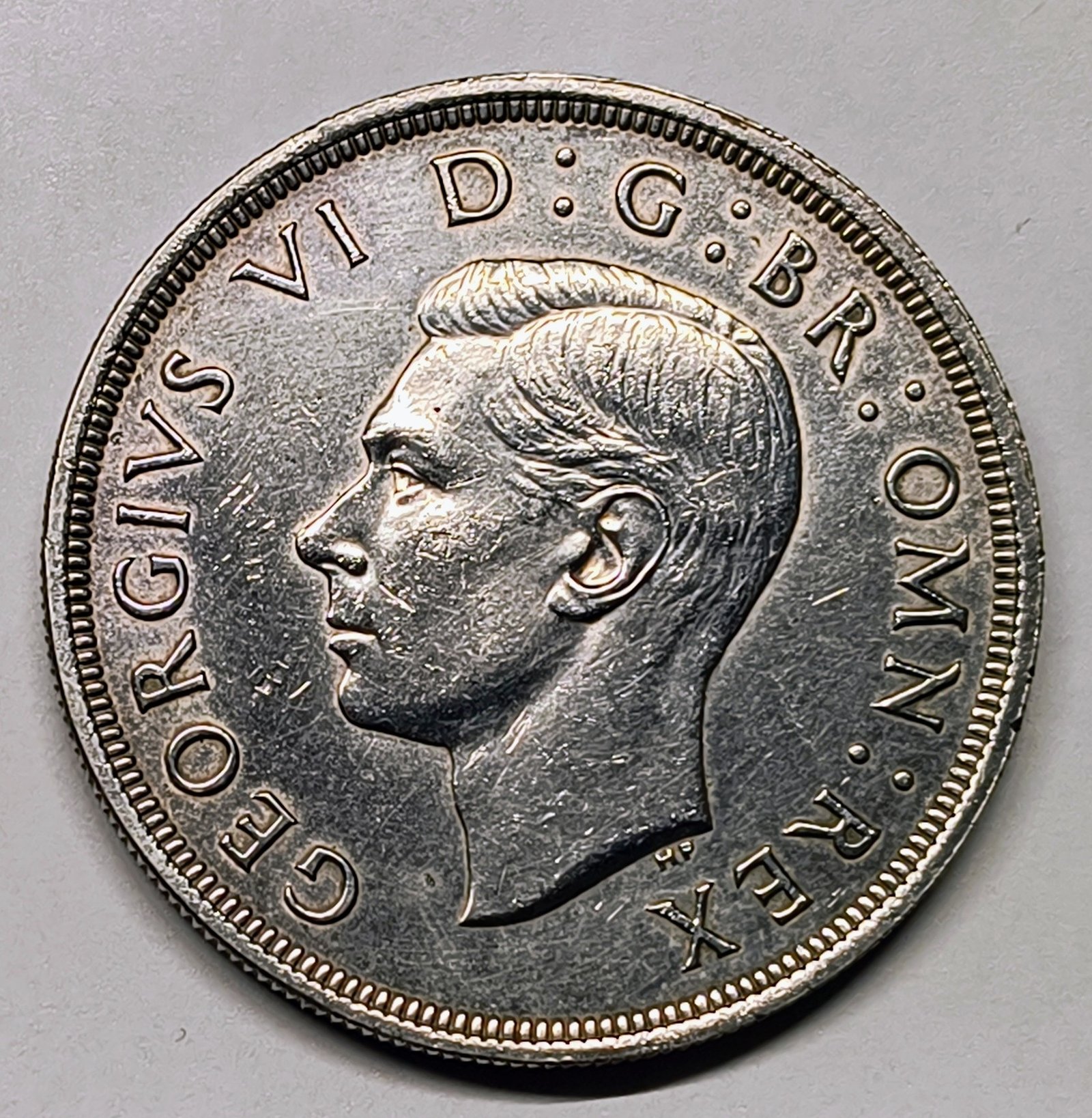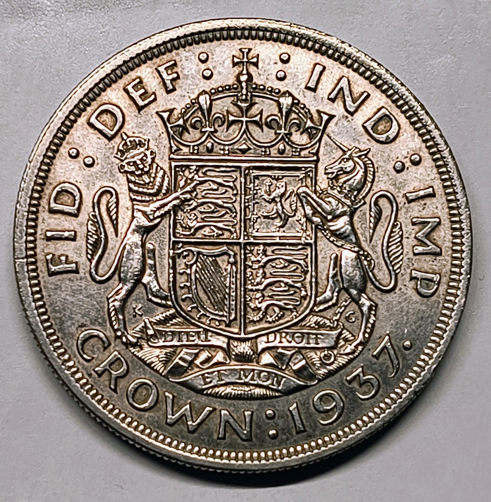 Moneda de 1 Corona (Crown) del Reino Unido, año 1937. Acuñada en plata 0,500 con motivo de la coronación del Rey Jorge VI. Peso de 28,25 g. Estado EBC. Una pieza de gran formato (38,6 mm) imprescindible en cualquier colección de numismática británica.