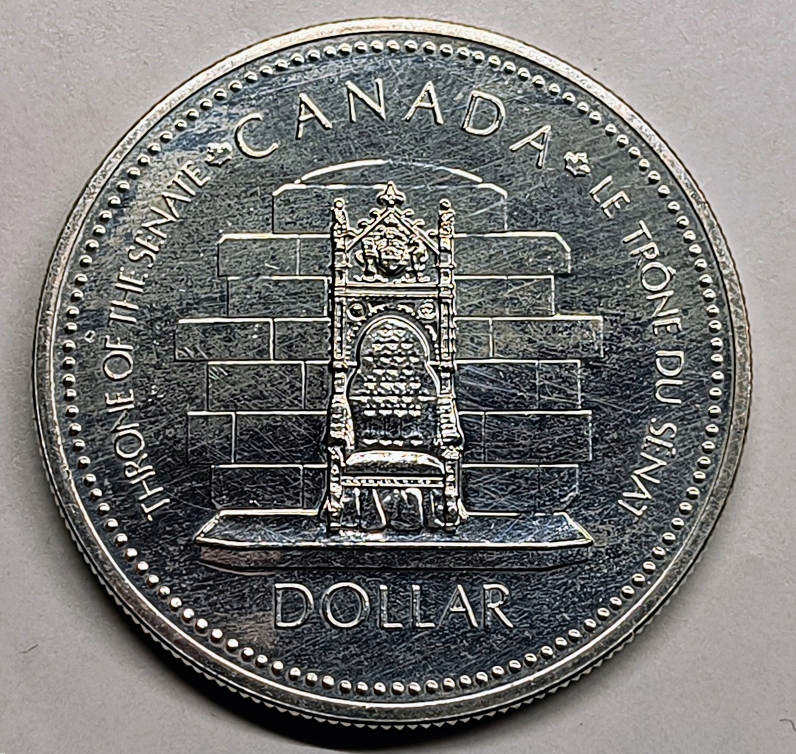 El Dólar de 1977 es una emisión especial de la Real Casa de la Moneda de Canadá para celebrar el Jubileo de Plata de la Reina Isabel II. El reverso presenta una imagen solemne del trono del Senado de Canadá, simbolizando la estabilidad de la monarquía parlamentaria. El anverso luce el retrato de la Reina diseñado por Arnold Machin.