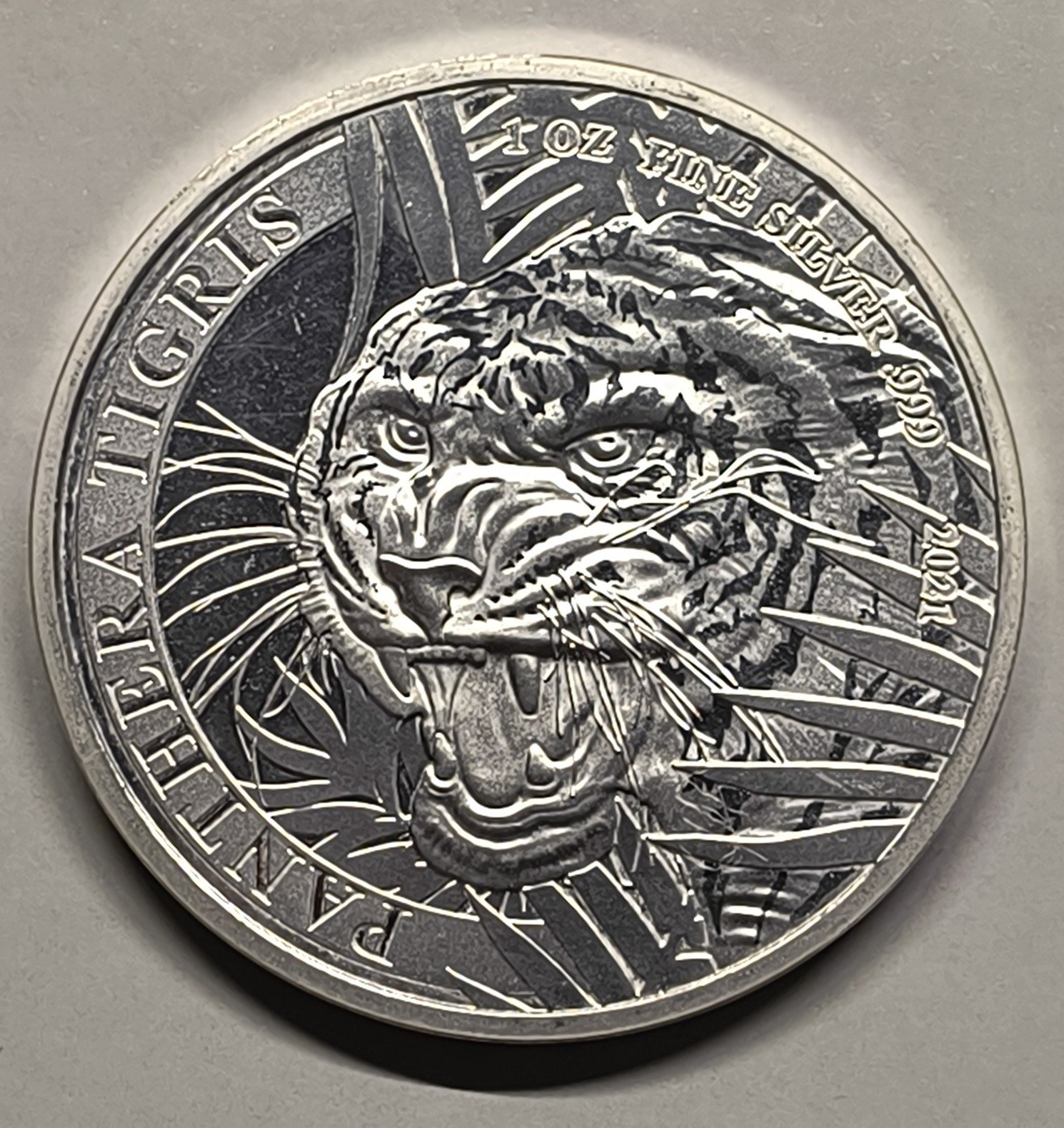 La moneda 1 oz Pantera Tigre 2021 de Laos está acuñada en plata .999 y muestra al majestuoso tigre emergiendo de la selva. Una pieza con fuerza, detalle y pureza excepcionales.