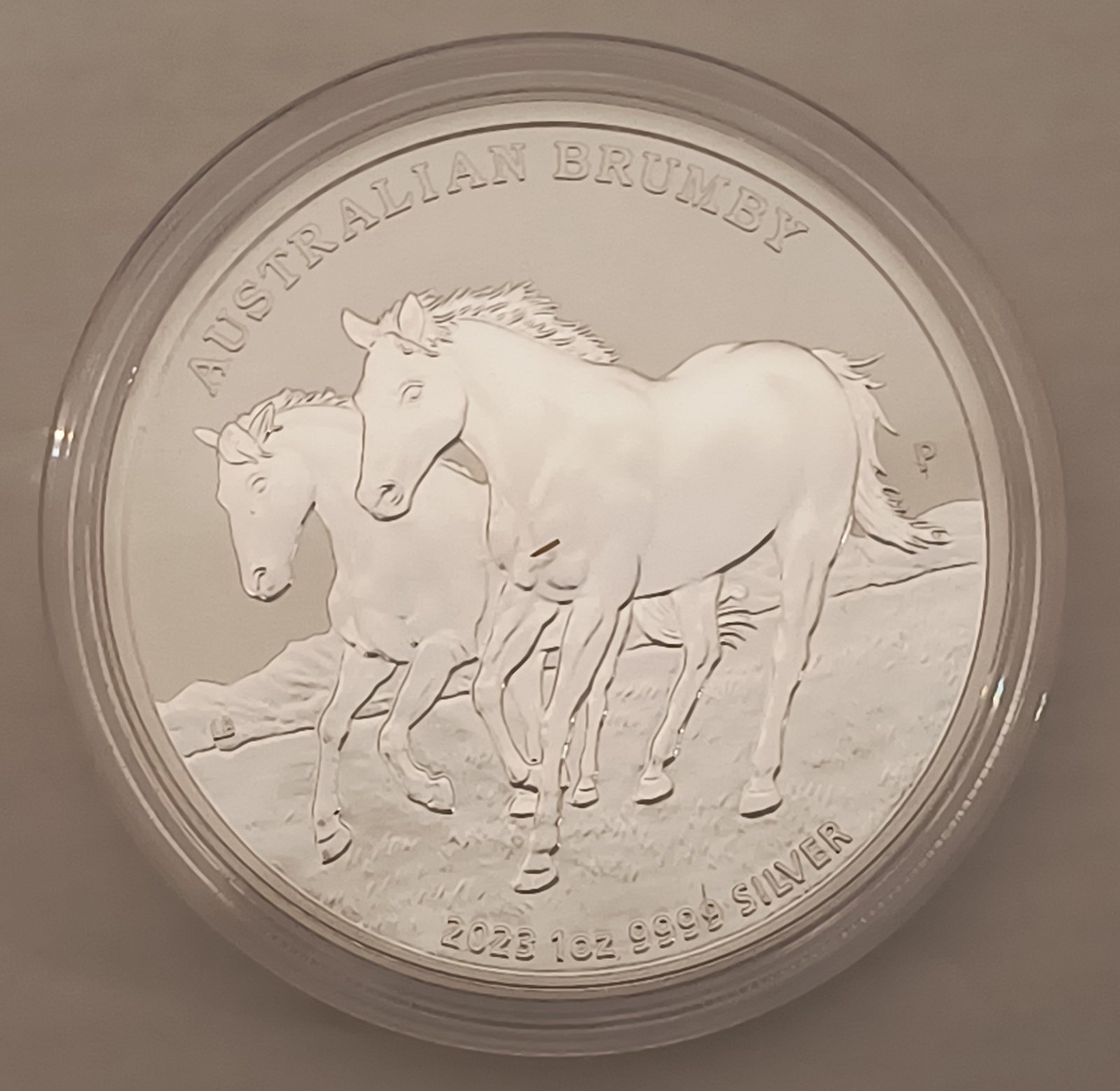 Diseño y Especificaciones: El reverso muestra un impresionante caballo Brumby salvaje en pleno galope. El diseño incluye el peso (1 oz), la pureza (9999 Silver) y el año 2023. El anverso presenta la efigie de la Reina Isabel II, al ser una moneda de curso legal de Australia. Su tirada tan limitada a 25,000 unidades la diferencia de otras monedas bullion australianas y asegura una fuerte demanda de coleccionistas.