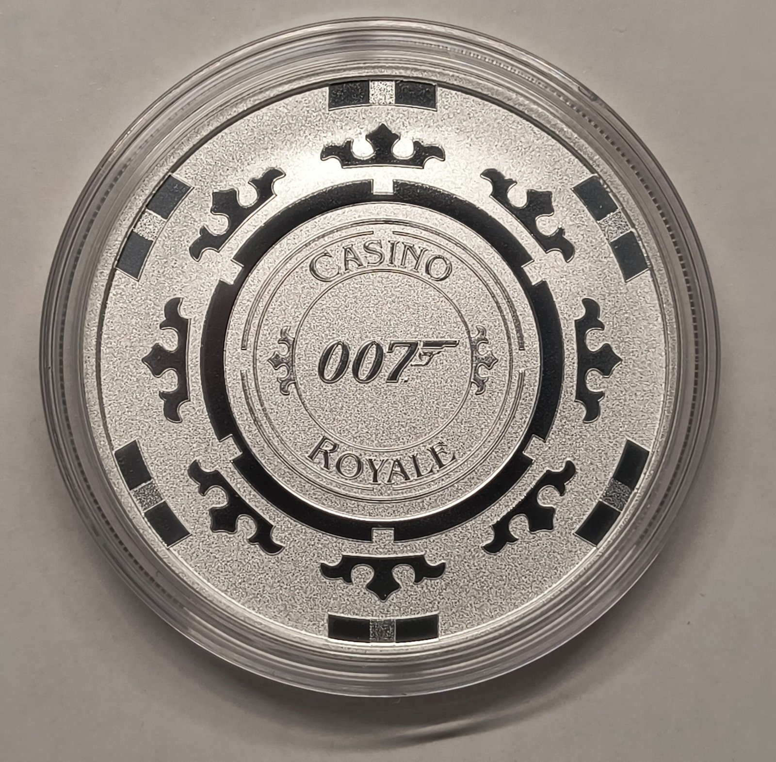Edición oficial de Perth Mint con licencia James Bond. Esta moneda de 1 oz celebra «Casino Royale», una pieza imprescindible para los seguidores de 007 y la numismática temática.