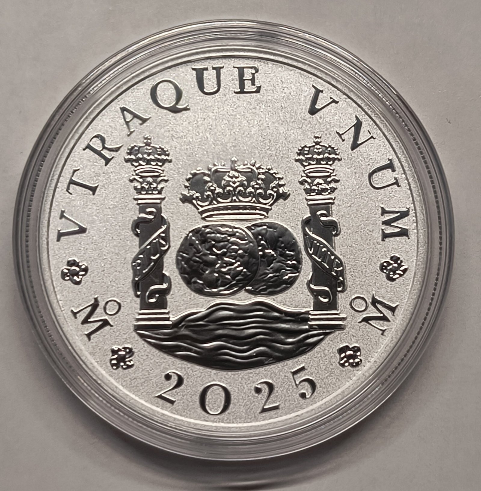 Diseño neocolonial basado en el real de a 8 español. Esta pieza moderna recrea el icónico dólar de columnas en plata pura con acabado brillante. Tirada de solo 30.000 monedas.