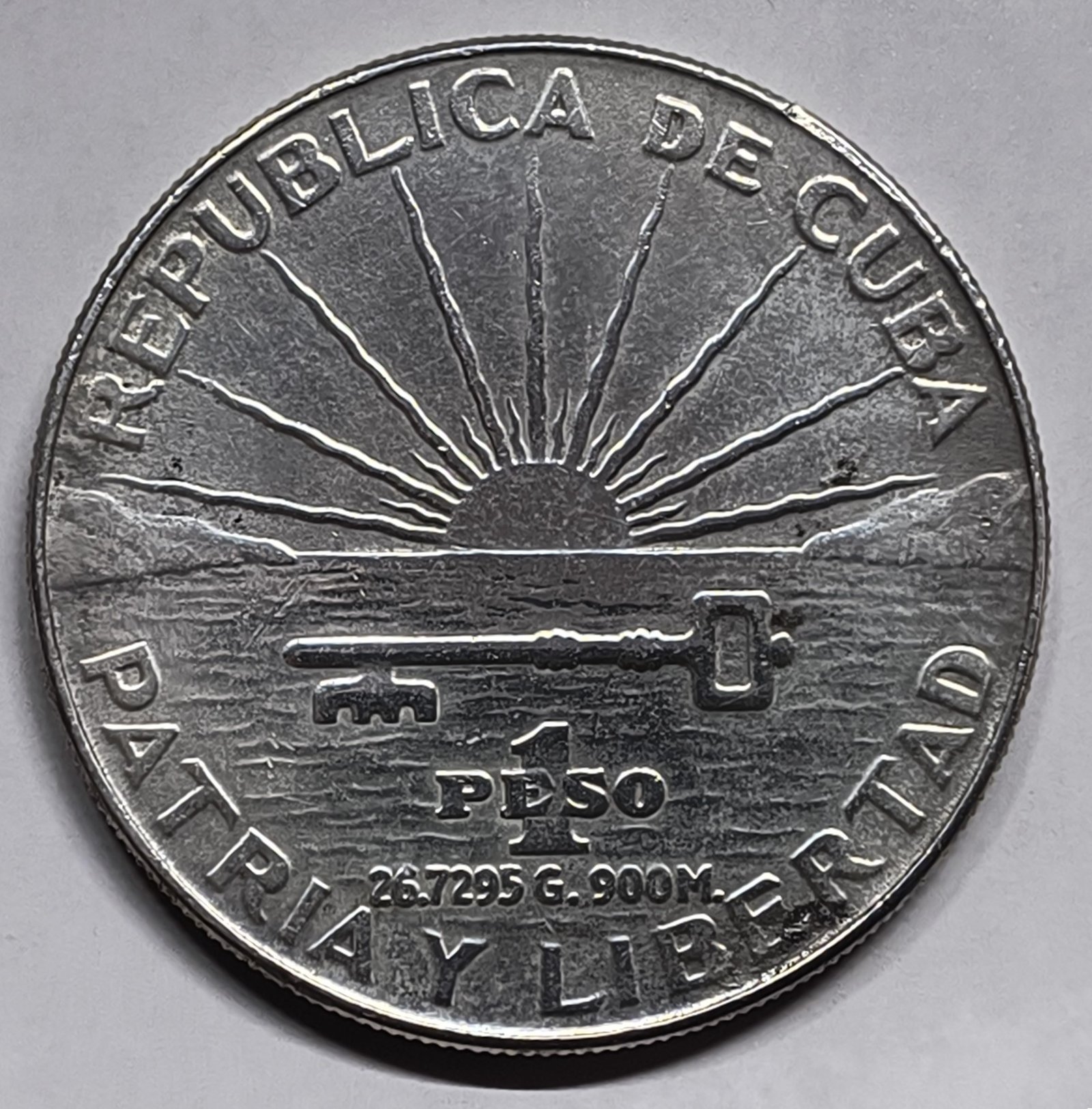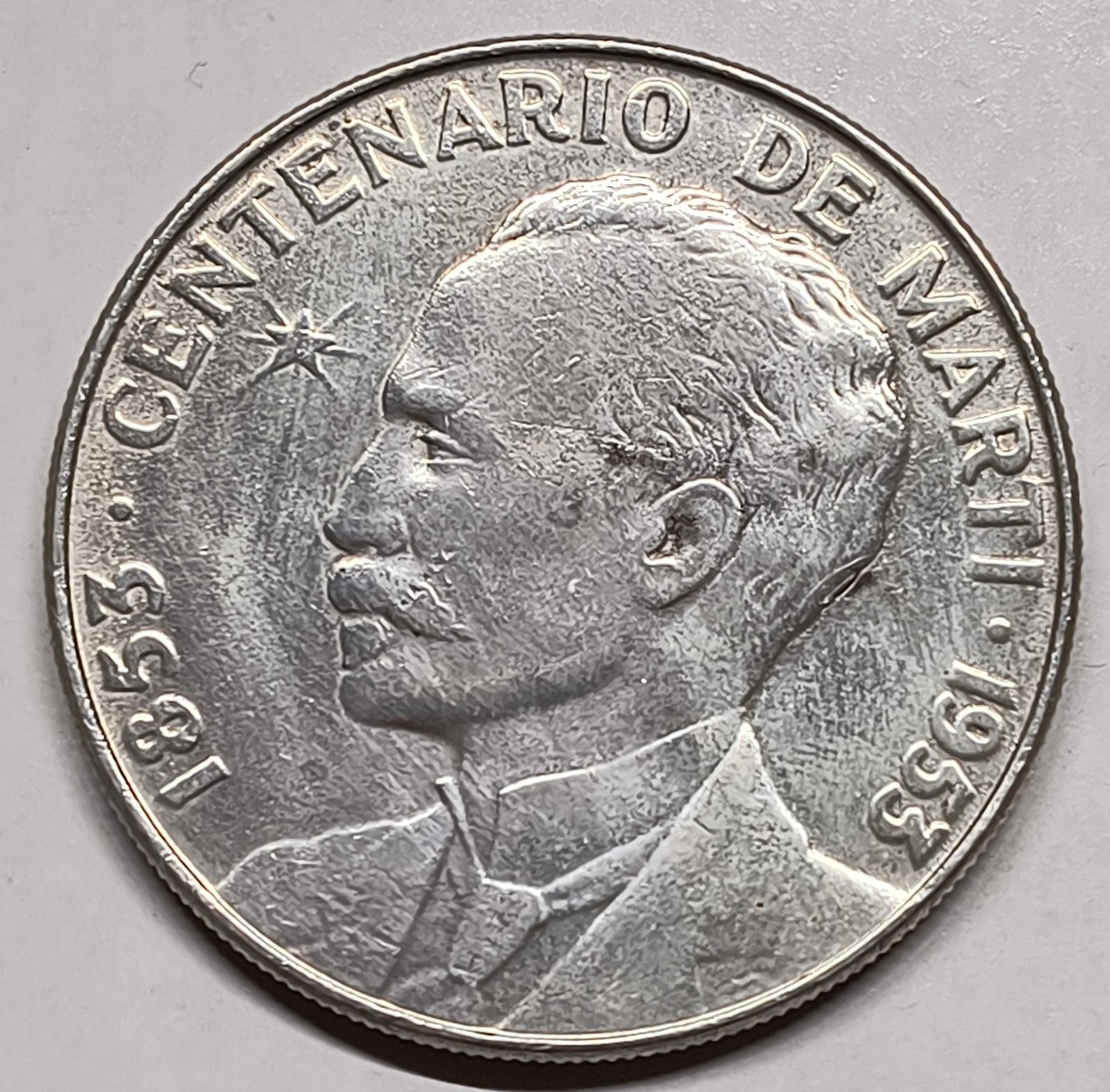 1 Peso Cuba 1953 MBC+, con un peso de 26,85g y un diámetro de 38 mm.