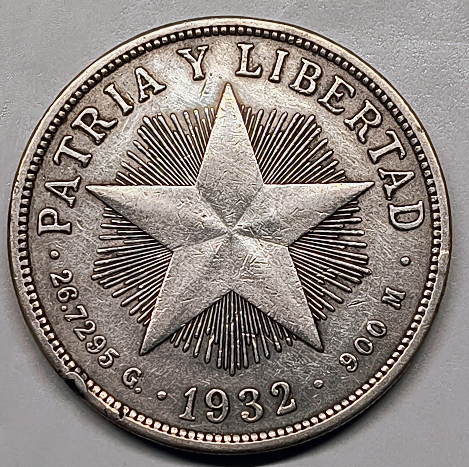 1 Peso de plata Cuba 1932, estrella solitaria, «Patria y Libertad». Plata 900‰, 26,68 g, 24,01 g de plata fina. Estado MBC-. Numismática cubana republicana.