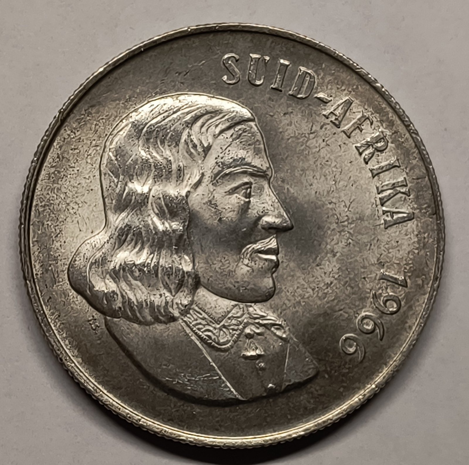 La moneda de 1 Rand Sudáfrica 1966 es una pieza histórica en plata de ley .800, acuñada en 1966 en la Casa de la Moneda de Pretoria. Pertenece a la primera serie de Rand en plata destinada a circulación, introducida en 1965 y reemplazada por níquel en 1977. Esta variante lleva leyenda en afrikáans: SUID-AFRIKA, con el busto de Jan van Riebeeck, fundador de la colonia holandesa del Cabo en 1652, figura central de la historia de Sudáfrica. Estado de conservación EBC (Extremadamente Buena Conservación / XF).