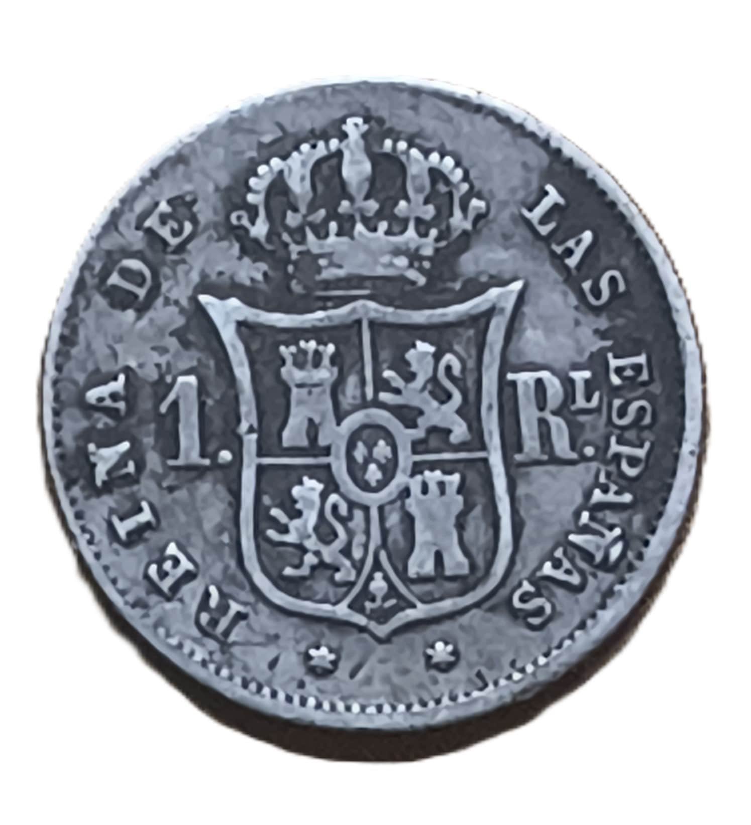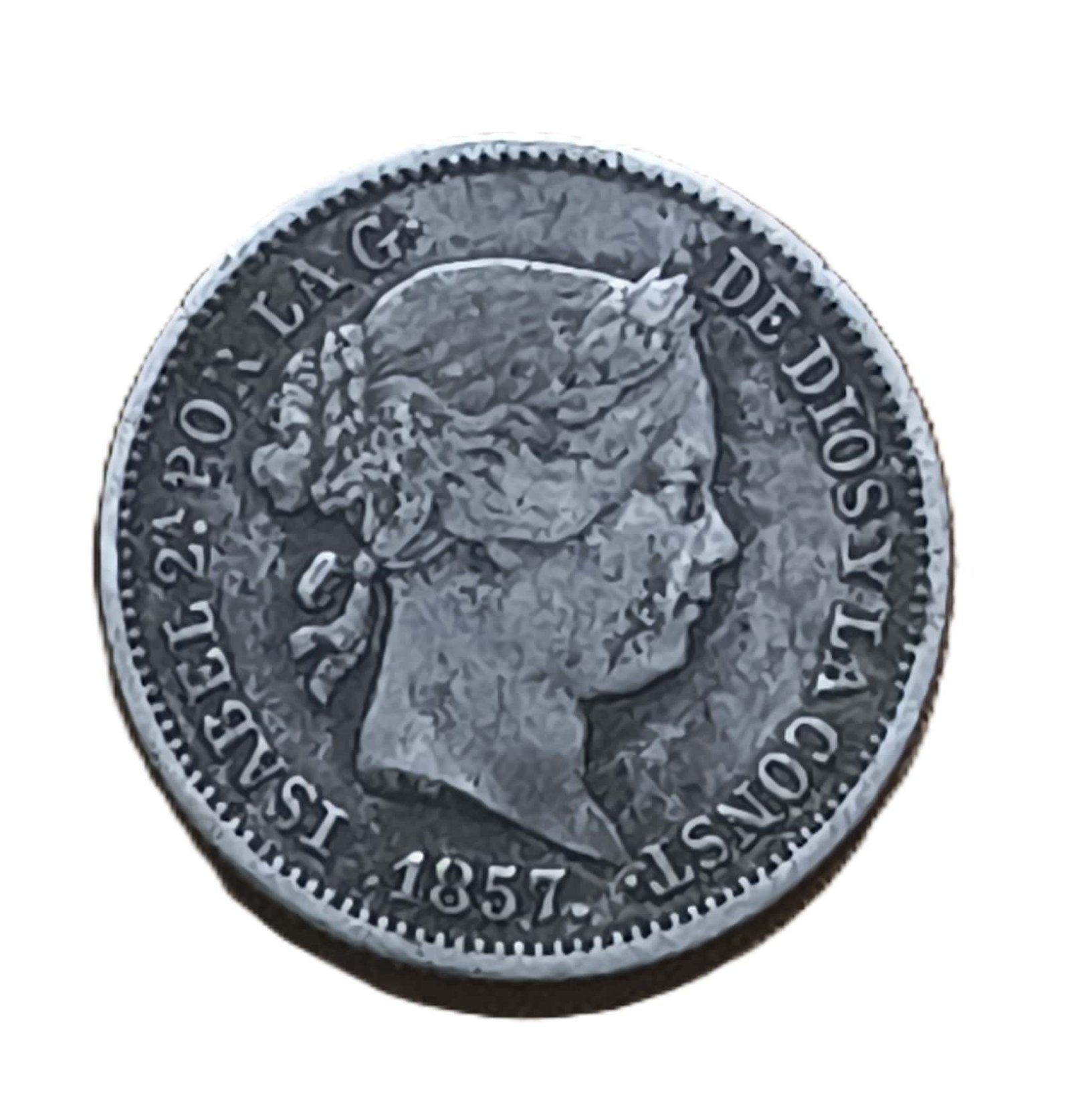 1 real Isabel II 1857 Sevilla en conservación VF+. Plata 0,900 con peso de 1,24 g. Pieza numismática clásica con historia.