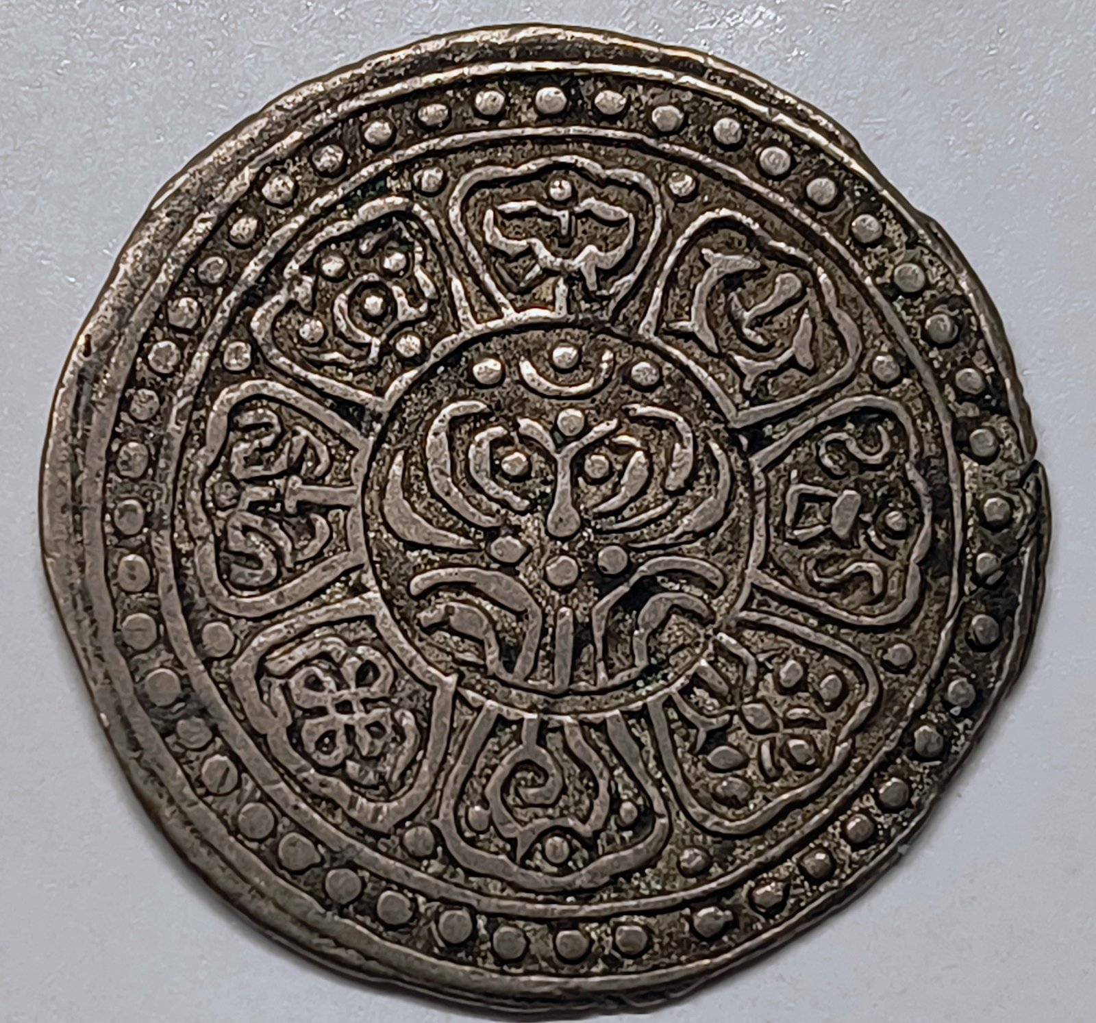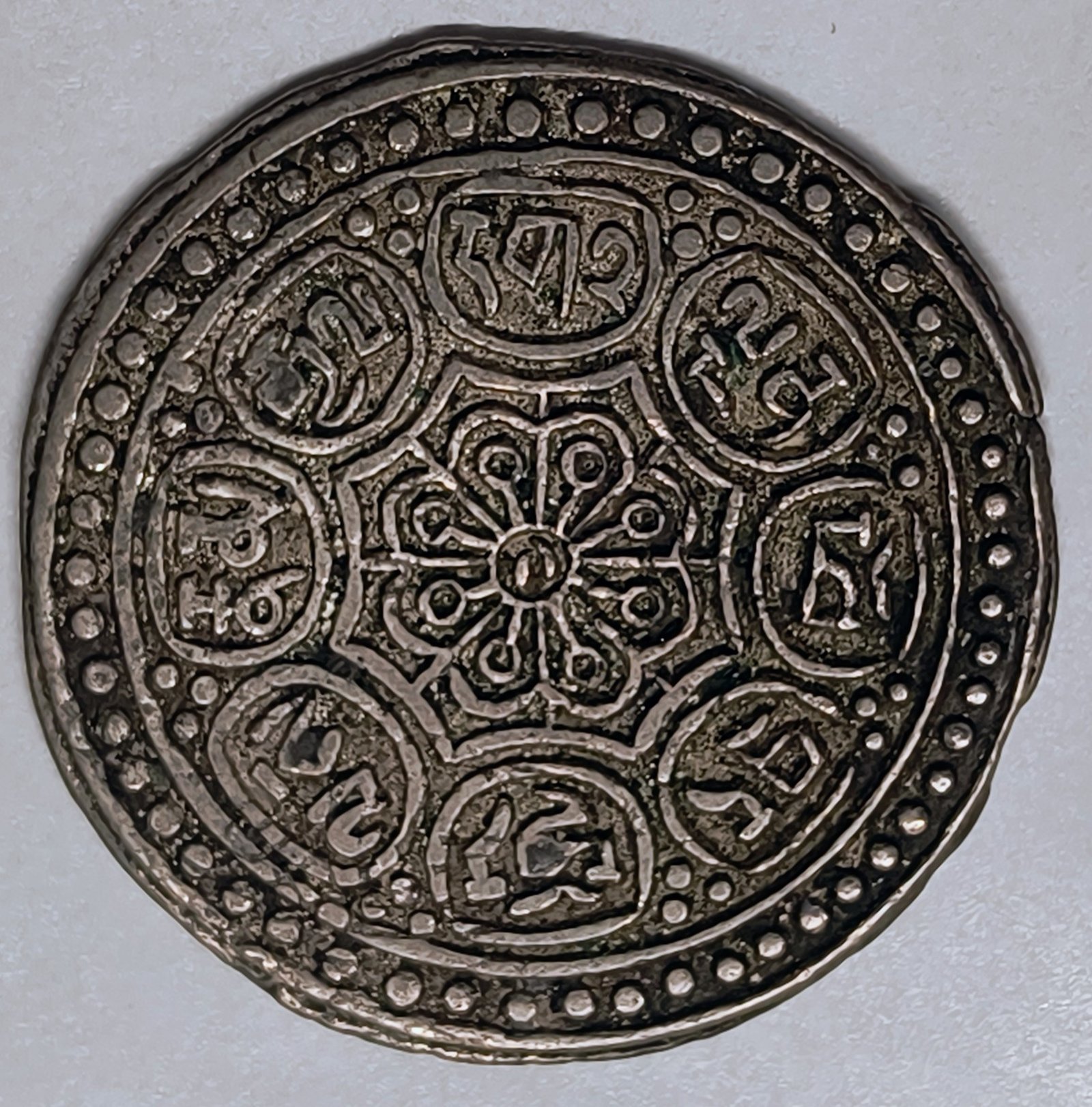 Moneda de 1 Tangka de plata vellón del Tíbet, período Ganden Phodrang. Acuñada manualmente con el icónico diseño de los 8 símbolos auspiciosos del budismo. Peso de 4,23 g. Estado MBC+. Una pieza imprescindible de la numismática del Himalaya y la Ruta de la Seda.