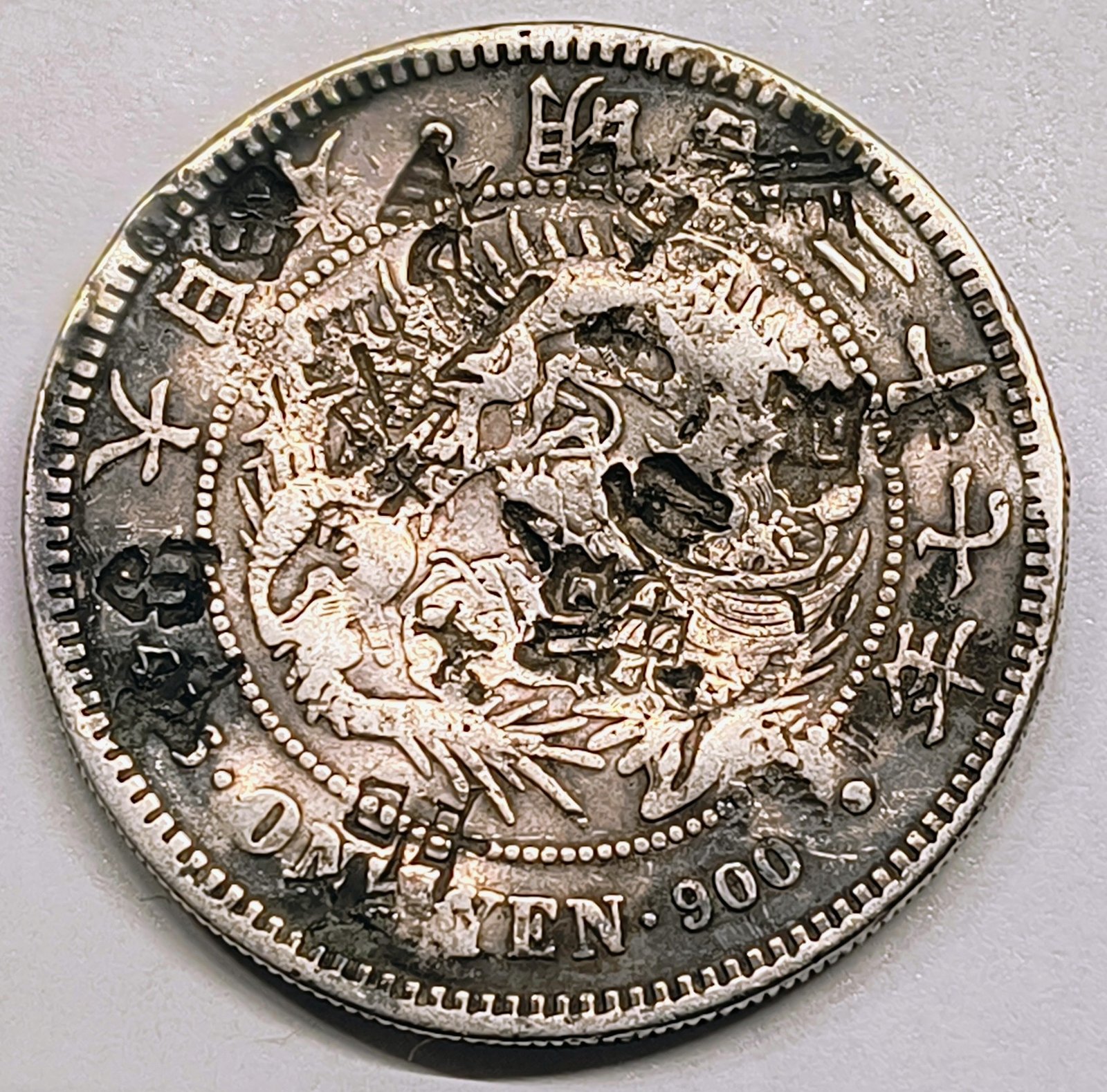 Majestuosa moneda de 1 Yen Japón 1894 Plata, acuñada en el año 27 de la era Meiji. Una pieza de plata ley .900 con un peso verificado de 26,73 g (24,26 g de peso fino teórico). Conservación MBC.