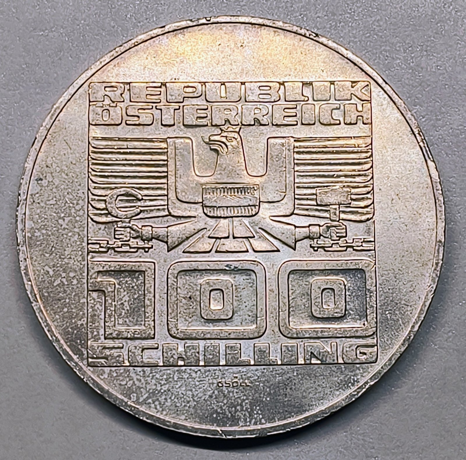 Moneda de 100 Schilling de Austria, año 1977. Acuñada en plata .640 con un peso de 23,93 g. Conmemorativa del 900º aniversario de la Fortaleza de Hohensalzburg. Estado EBC+. Gran detalle arquitectónico.