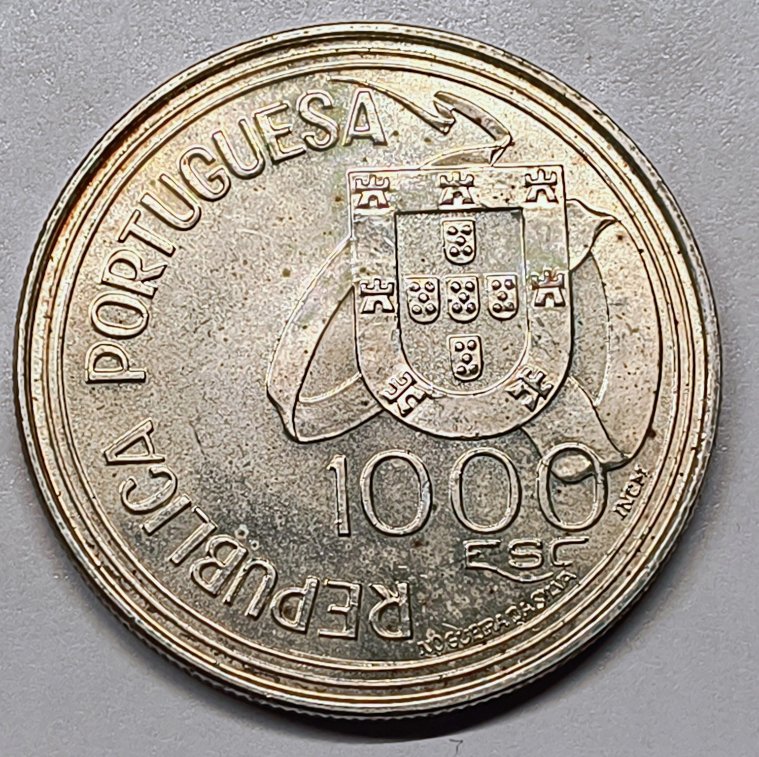 La moneda de 1000 Escudos de 1994 celebra uno de los hitos diplomáticos más importantes de la Era de los Descubrimientos: el Tratado de Tordesillas. El reverso presenta una composición cartográfica magistral con la línea de demarcación que dividió las zonas de influencia de Portugal y España, acompañada de carabelas y rosas de los vientos. El anverso muestra el escudo nacional portugués sobre una representación del globo terráqueo.
