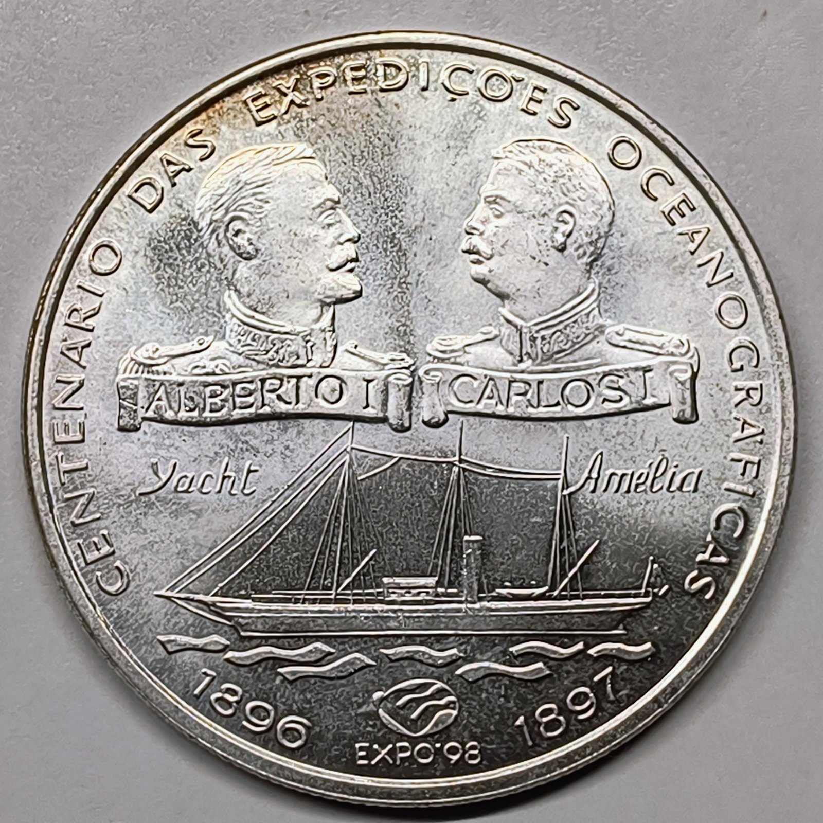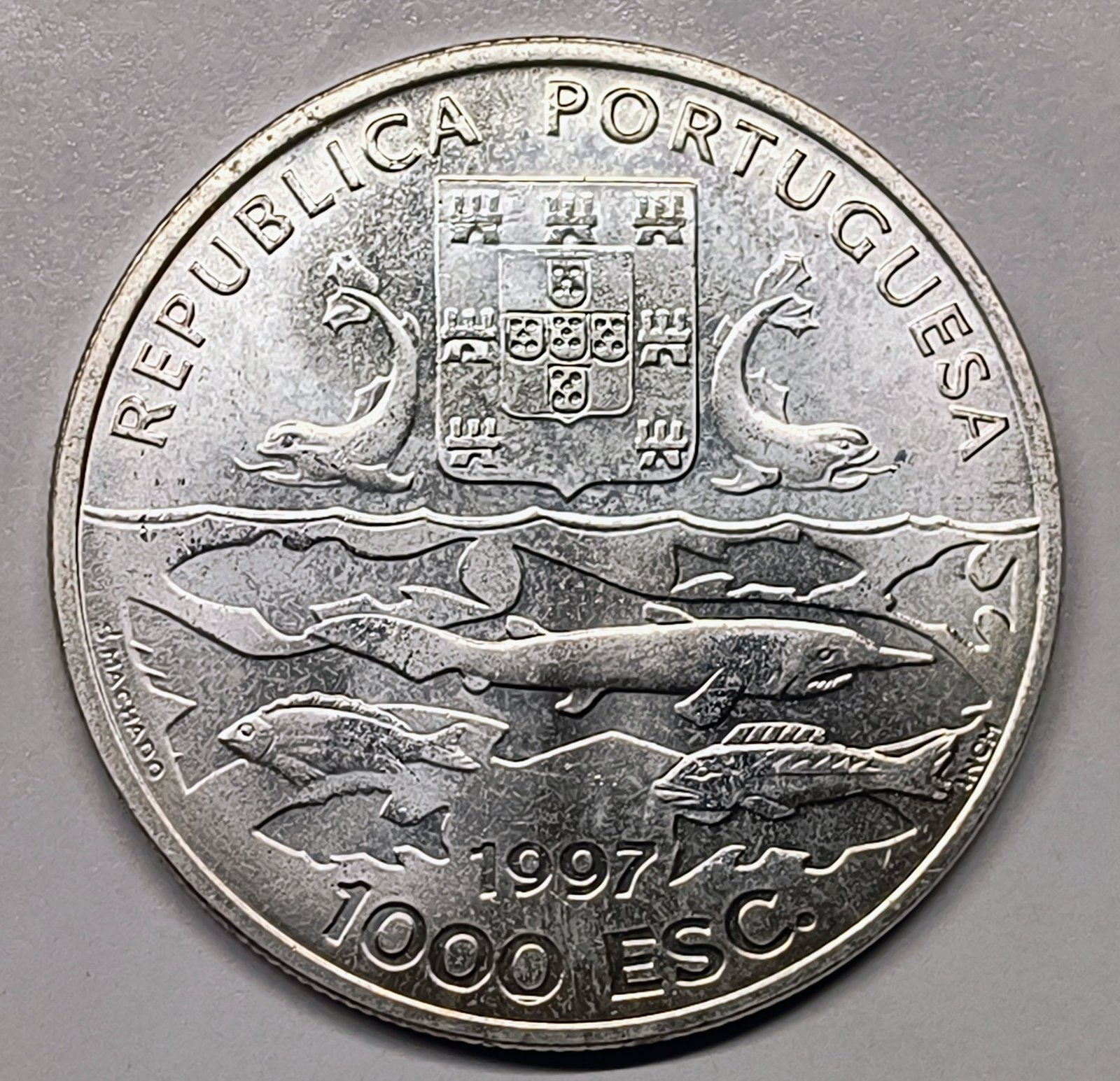 La moneda de 1000 Escudos de 1997 rinde homenaje a las Expediciones Oceanográficas, pilares del conocimiento científico marino de Portugal. El diseño es uno de los más atractivos de la serie: el anverso muestra el escudo nacional sobre una composición geométrica, mientras que el reverso presenta un barco de investigación navegando sobre ondas estilizadas, junto a instrumentos de medición oceánica.