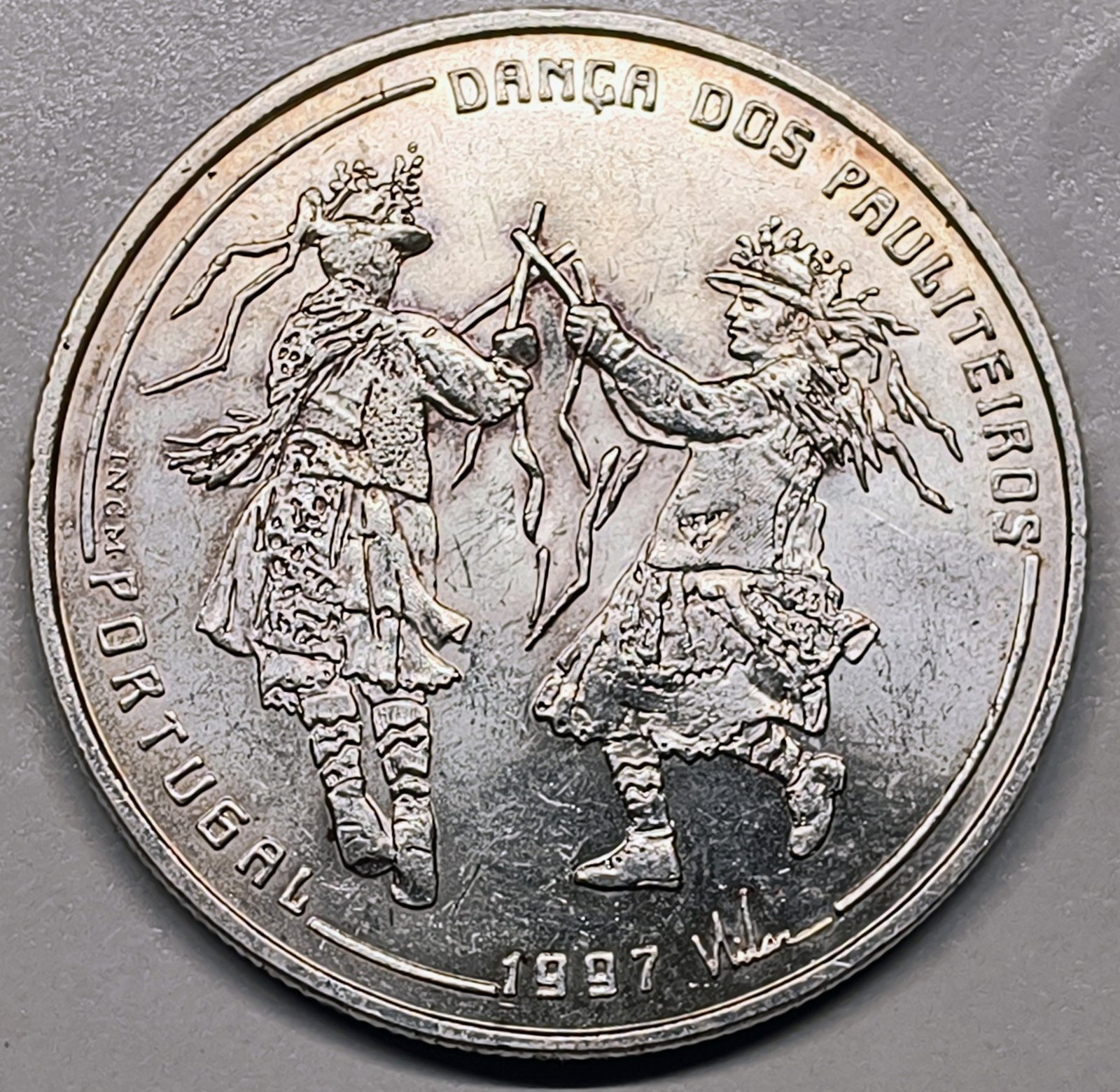La moneda de 1000 Escudos de 1997 es un homenaje a la riqueza cultural de la región de Miranda do Douro. Los Pauliteiros son protagonistas de una danza guerrera ancestral, ejecutada con palos (paulitos), que ha sobrevivido como símbolo de la identidad trasmontana. El anverso muestra el escudo de Portugal sobre un diseño geométrico, mientras que el reverso captura con gran dinamismo el movimiento de los danzantes con sus trajes típicos.
