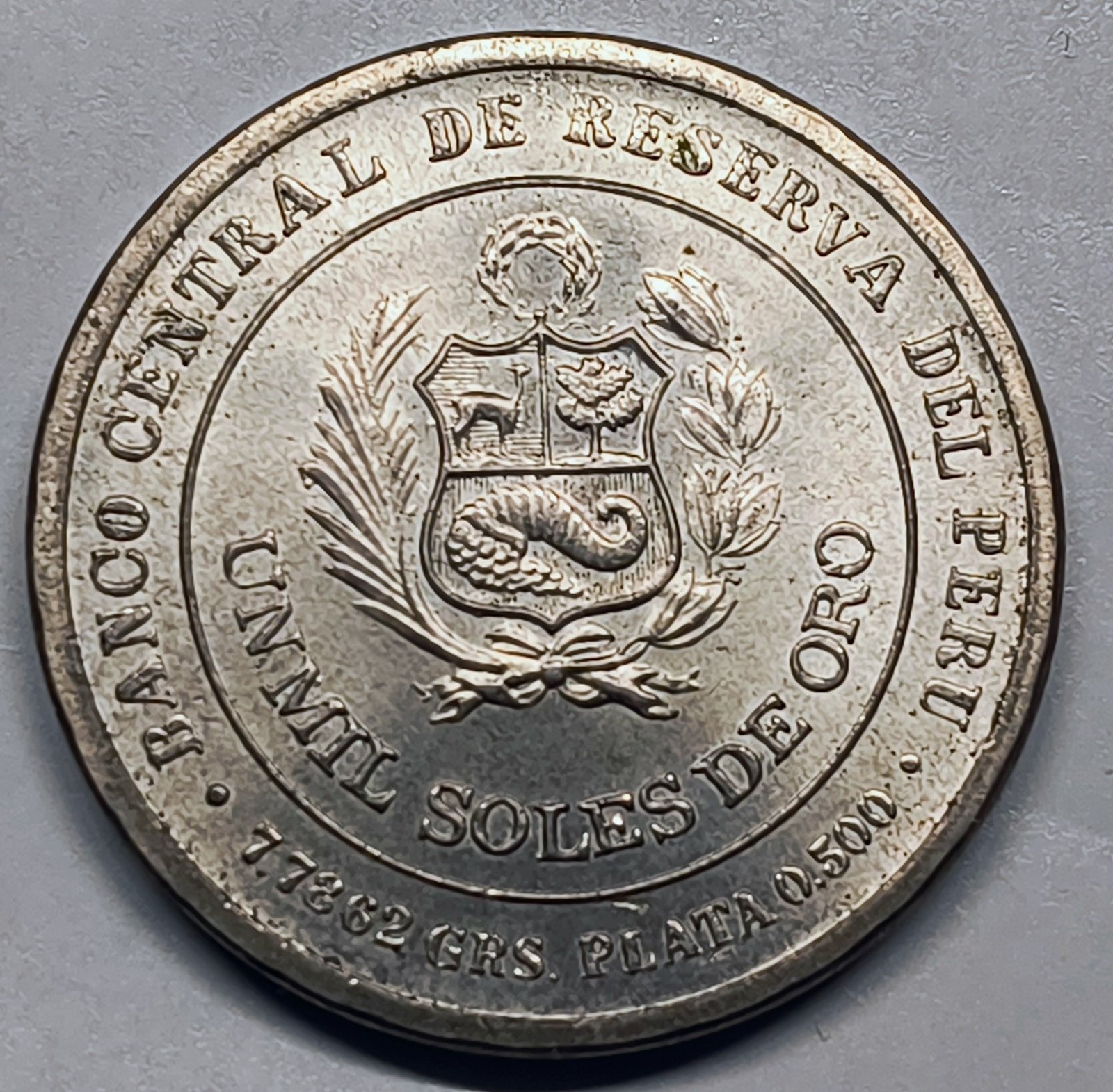 La moneda de 1000 Soles de 1979 rinde homenaje a los 150 años de la instalación del Primer Congreso Constituyente del Perú. Es una pieza de gran simbolismo político e histórico. El anverso presenta el Escudo de Armas del Perú, mientras que el reverso muestra la imponente fachada del Palacio Legislativo en Lima, sede del poder parlamentario.
