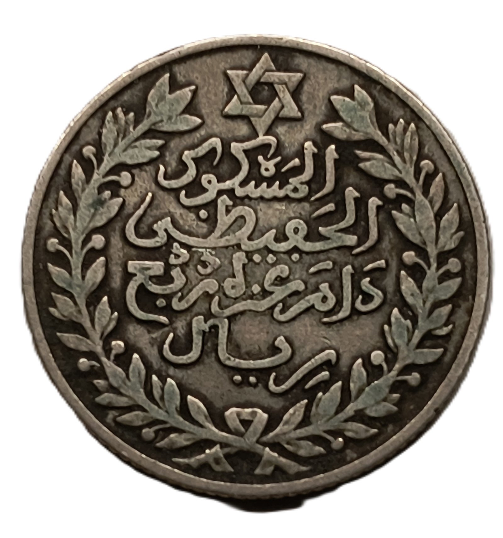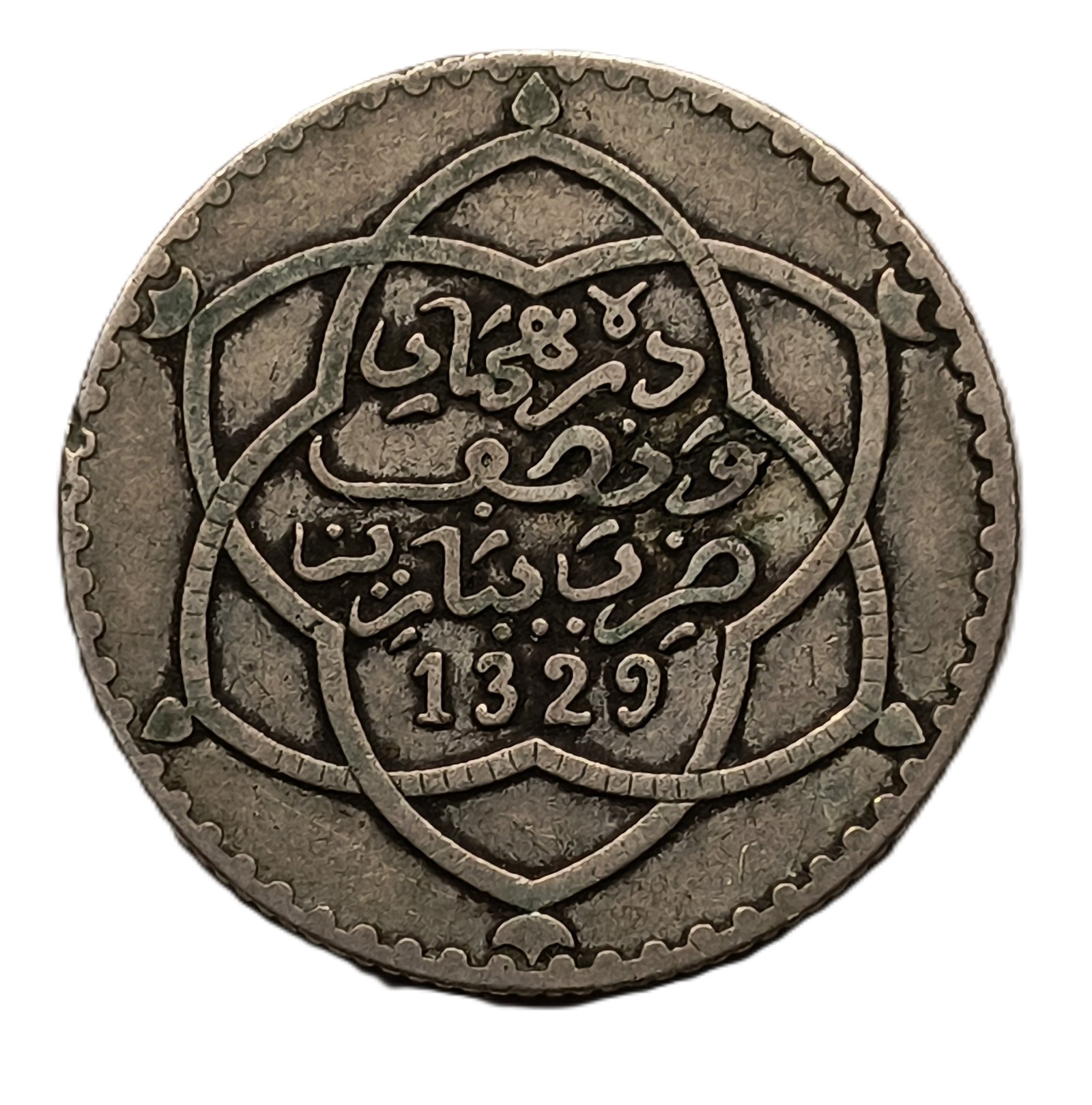 Moneda de 1/4 de Rial fechada en 1329, con plata 0,835 y peso de 6,1 gramos. Conservación VF, con detalles medievales visibles. Pieza perfecta para coleccionistas de monedas históricas marroquis.