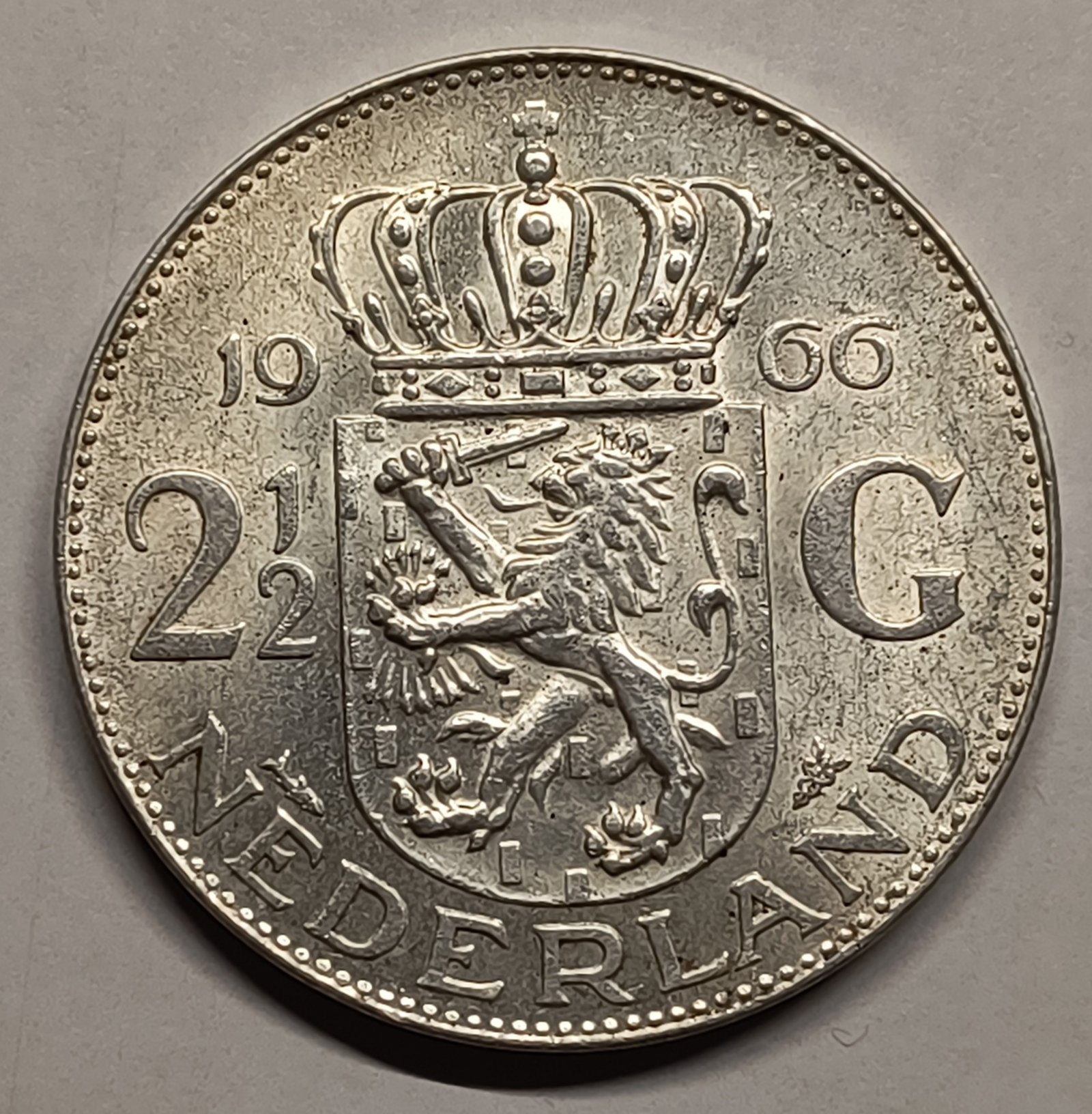 Moneda de 2½ Gulden (Rijksdaalder) de los Países Bajos, año 1966. Acuñada en plata 0,720 con un peso de 15 g. Retrato de la Reina Juliana y escudo real coronado. Estado MBC+. Una pieza clásica y robusta de la numismática europea.