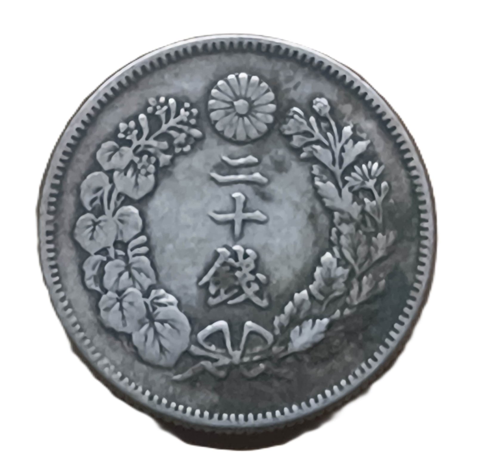 20 sen 1908 plata, en plata de 80%, peso 4 g y diámetro 20,3 mm. Moneda de la era Meiji que refleja el poder emergente de Japón como nación industrial. Conservación XF.