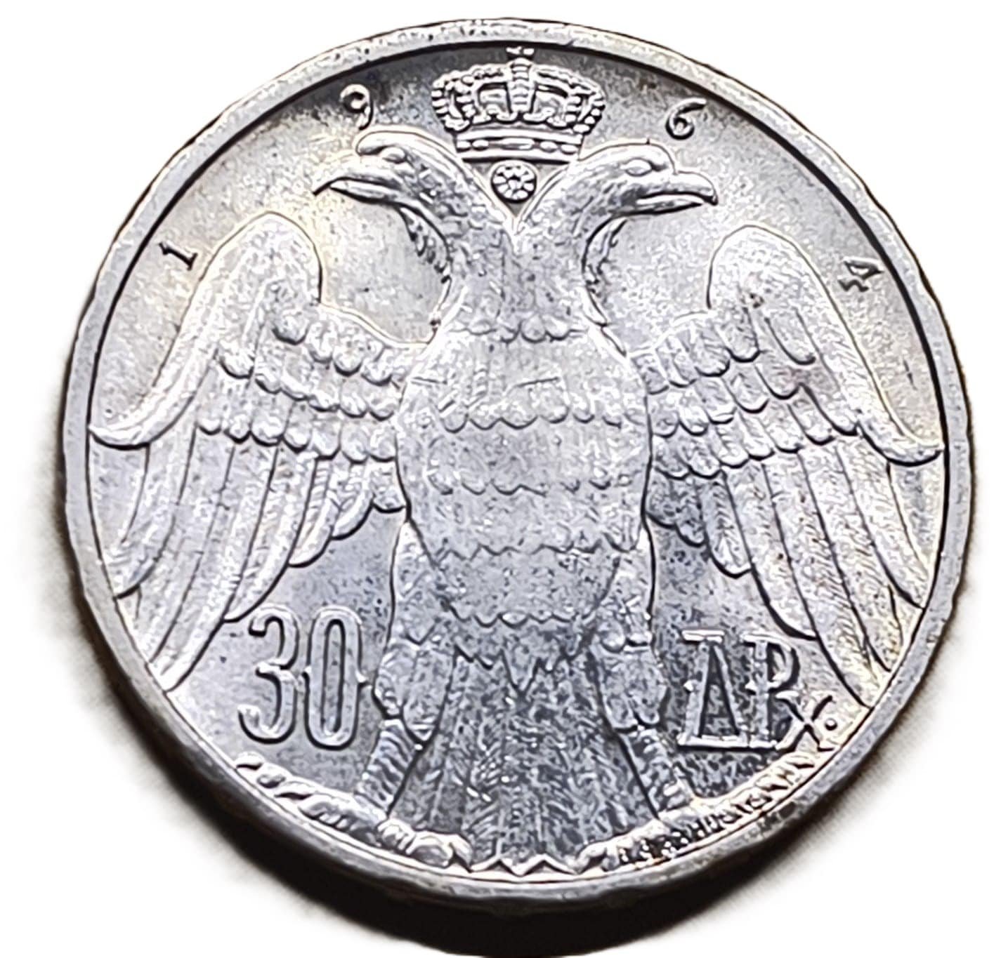 La 30 Drachmai Grecia 1964 SC es una moneda histórica en plata de ley .835. Una pieza con gran valor numismático e histórico para coleccionistas especializados.