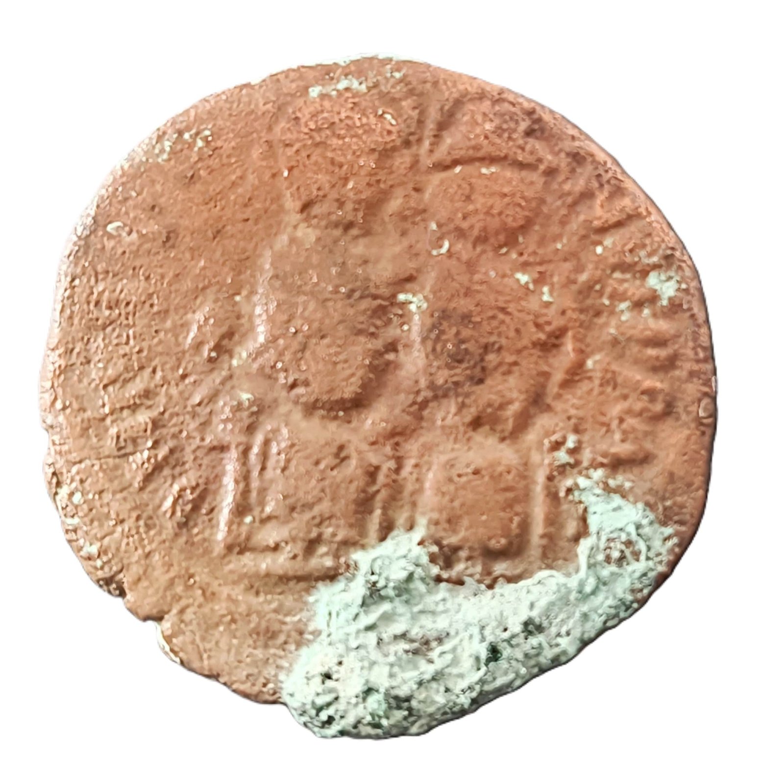 Moneda de 40 nummi del Imperio Bizantino, acuñada en Nicomedia entre los años 569 y 570 d.C. Representa a Justin II y Aelia Sophia. Gran pieza de bronce con patina natural y buen relieve. Ideal para coleccionistas de monedas bizantinas.