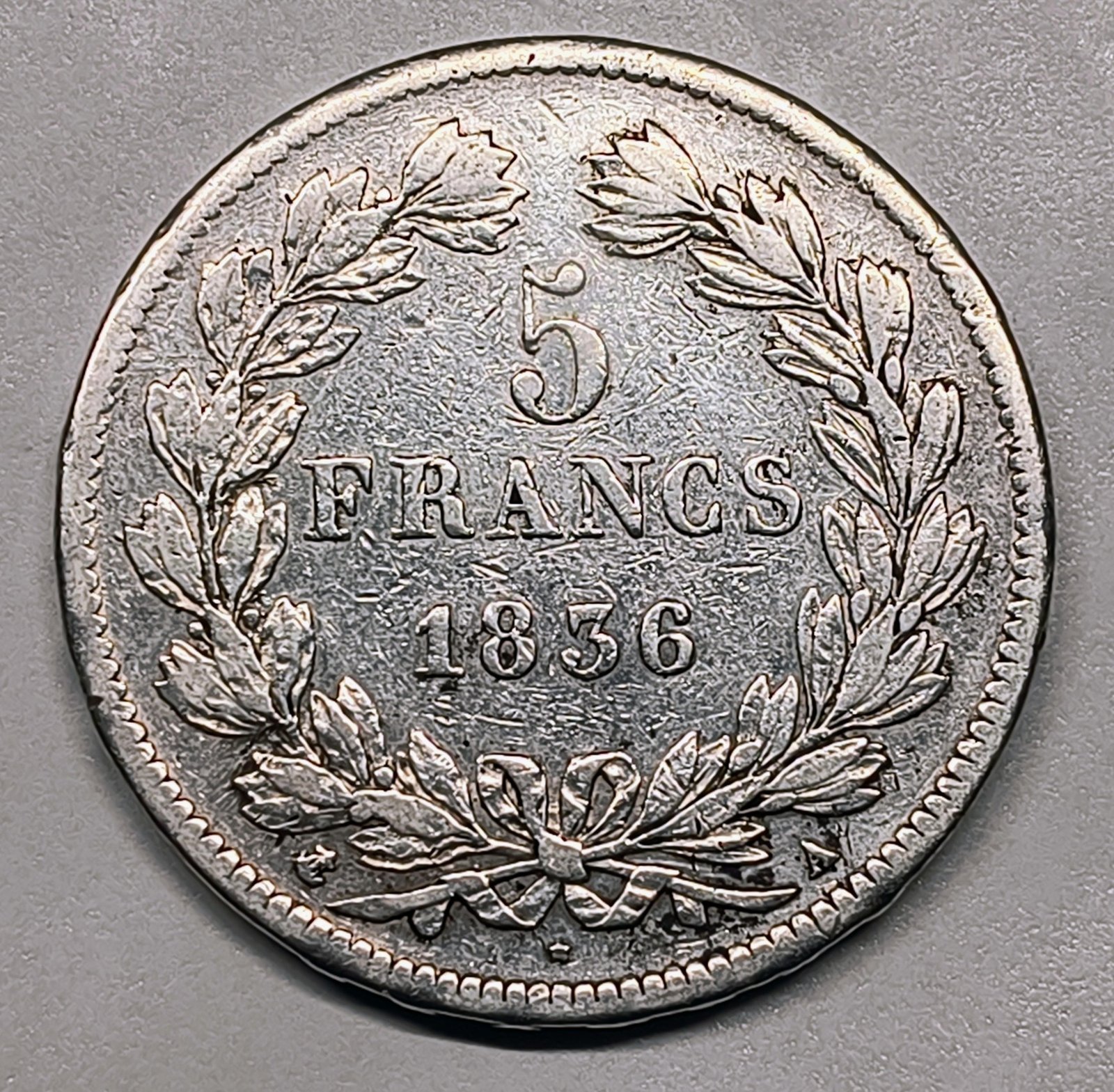 Anverso: busto laureado de Louis-Philippe I a la derecha, leyenda circular LOUIS PHILIPPE I ROI DES FRANÇAIS. Reverso: valor 5 FRANCS sobre la fecha 1836, dentro de corona formada por rama de laurel a la izquierda y de olivo a la derecha, unidas por cinta en la base; diferente de ceca y marcas de grabador en exergo. Canto en relieve: DIEU PROTÈGE LA FRANCE.