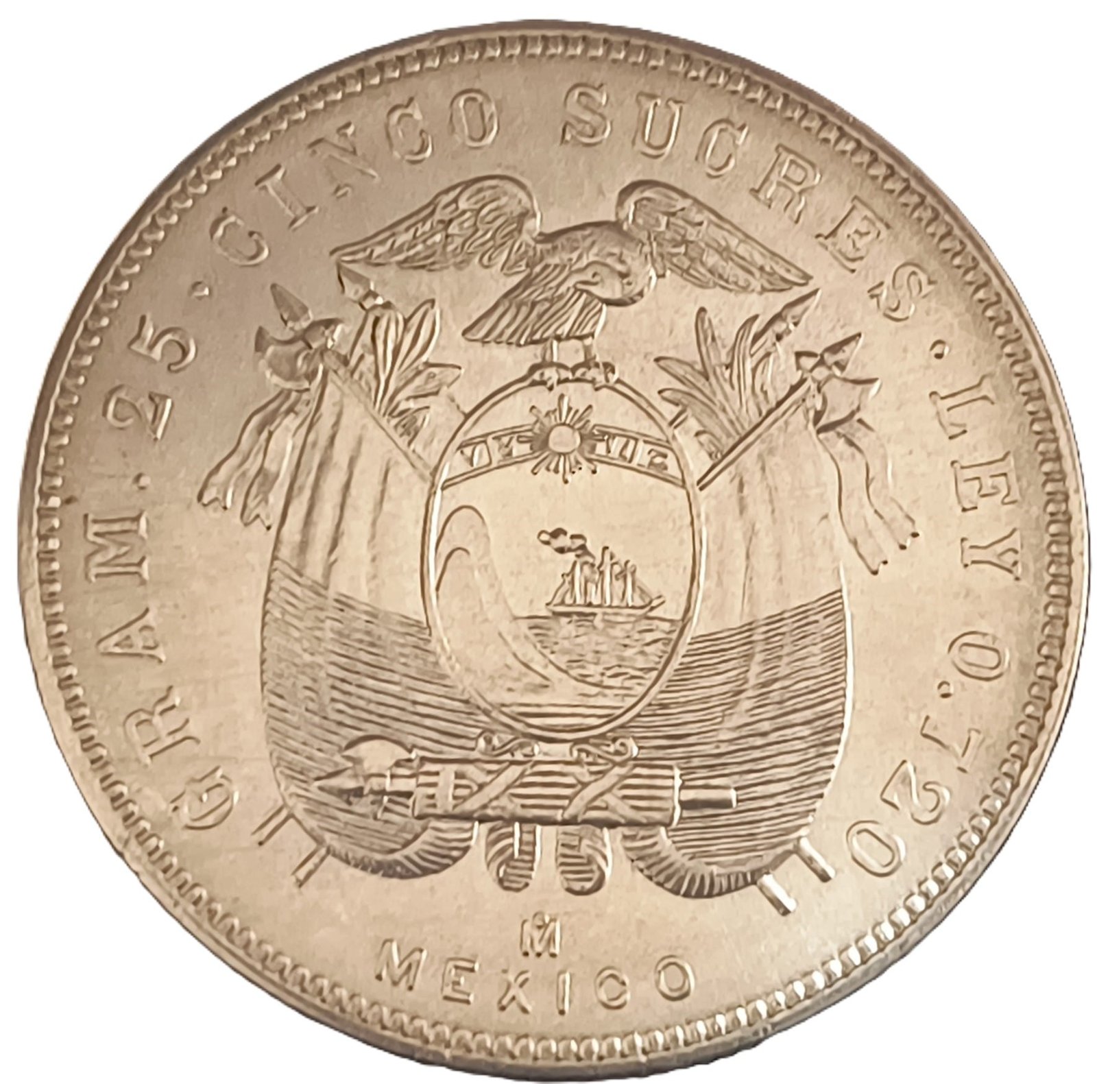 5 Sucres Ecuador 1944 – Plata Ley .720 – Estado AU (Limpiada)