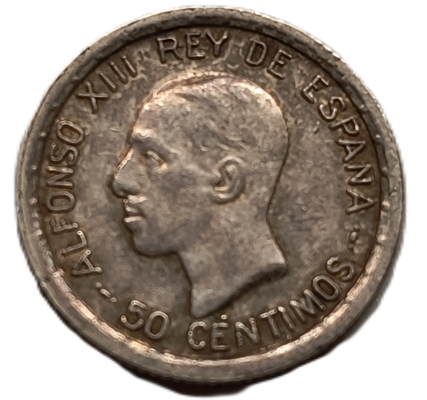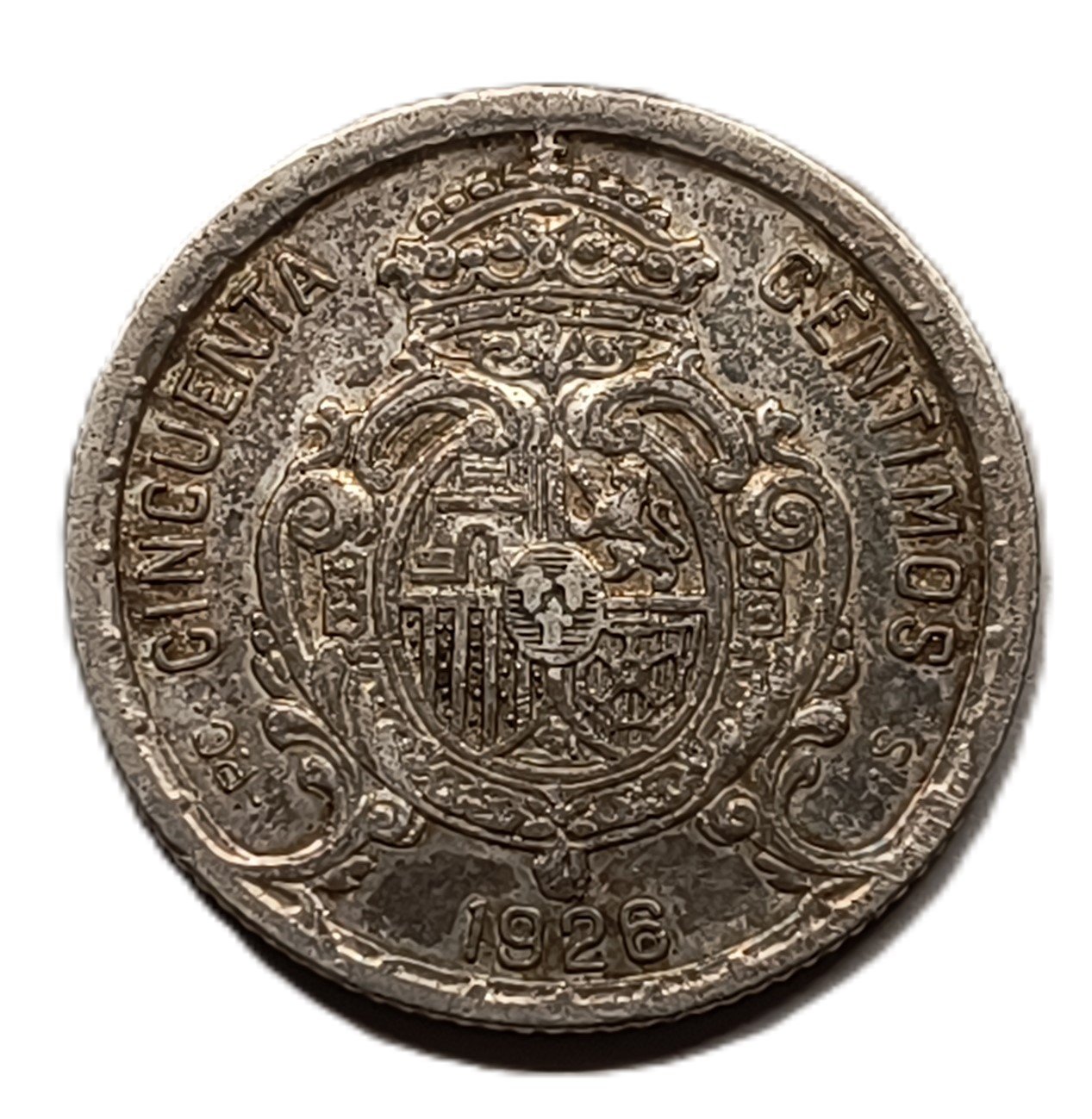 50 céntimos de peseta 1926, reinado de Alfonso XIII. Acuñada en plata 0,835 con 2,425 g de peso. Excelente conservación (AU), detalles finos y claros. Moneda de pequeño formato y gran interés para coleccionistas de la monarquía española.
