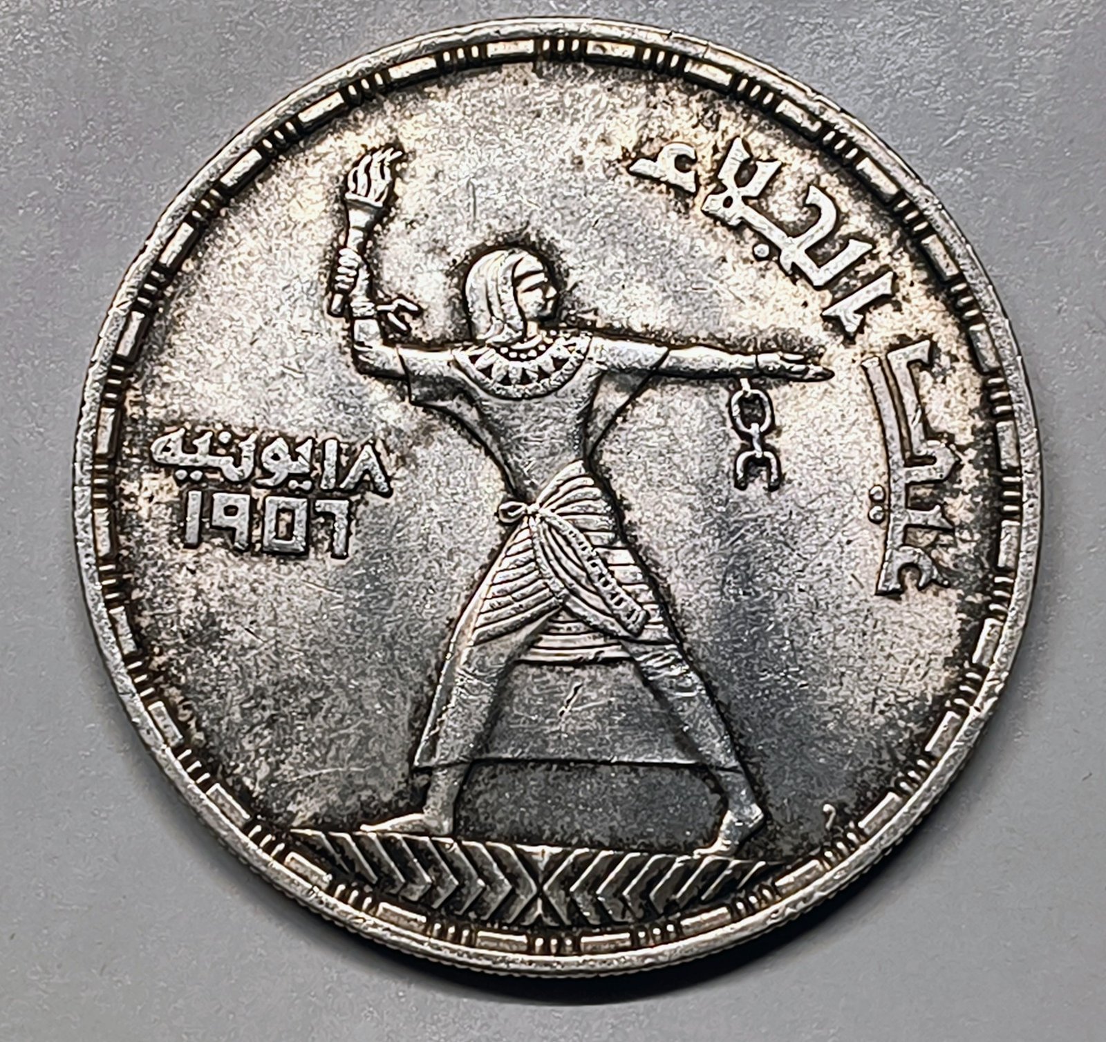 La moneda de 50 Piastras de 1956 es un monumento numismático a la soberanía egipcia. Emitida bajo el gobierno de Gamal Abdel Nasser, celebra la salida definitiva de las tropas británicas del Canal de Suez. El anverso presenta una alegoría poderosa: una mujer de pie rompiendo las cadenas de la dominación colonial, símbolo del despertar de la nación árabe.