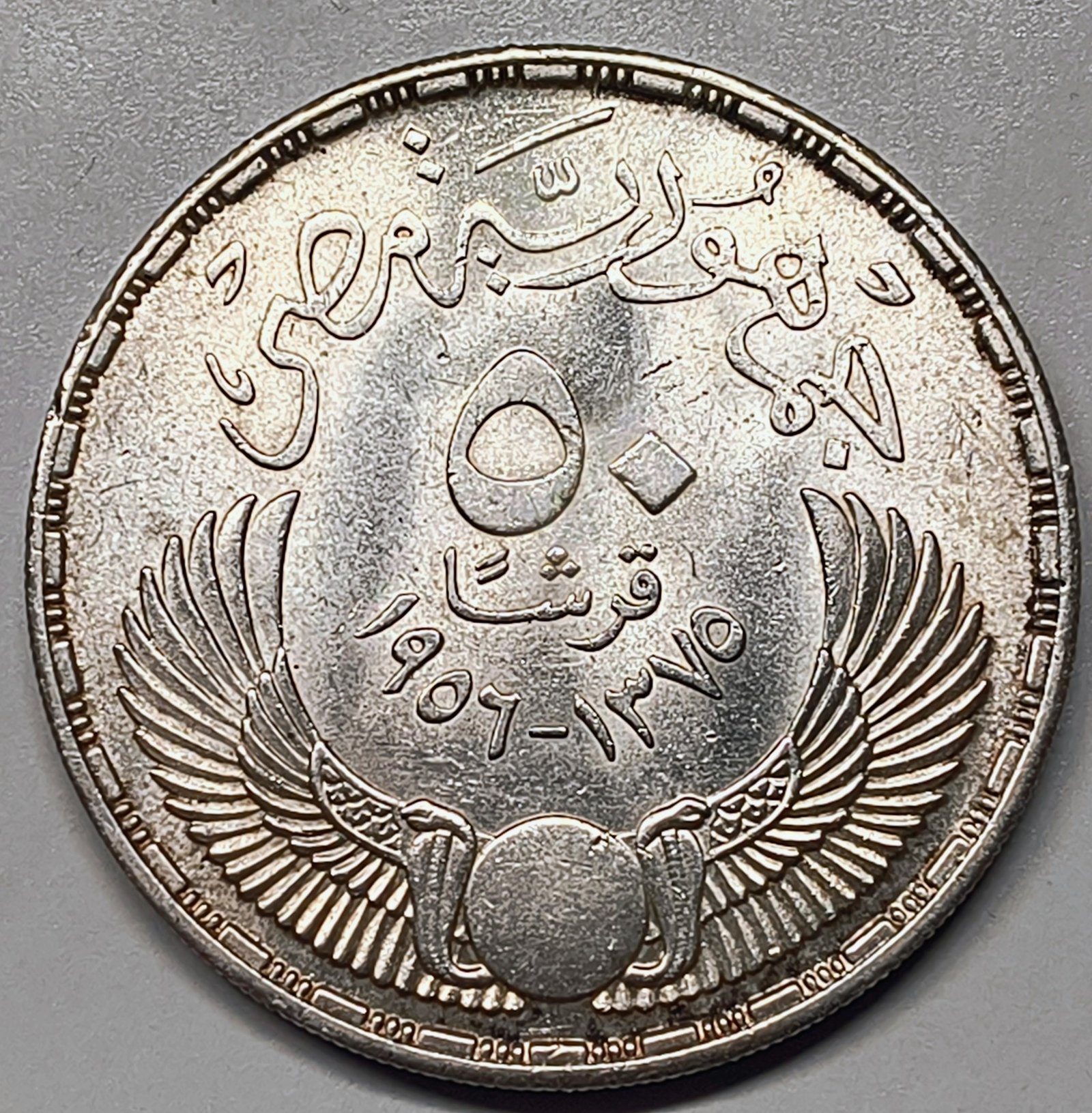 Moneda de 50 Piastras de la República de Egipto, año 1956 (AH 1375). Conmemorativa de la evacuación de las tropas británicas. Plata .900, peso 28 g. Gran módulo de 40 mm. Estado EBC.