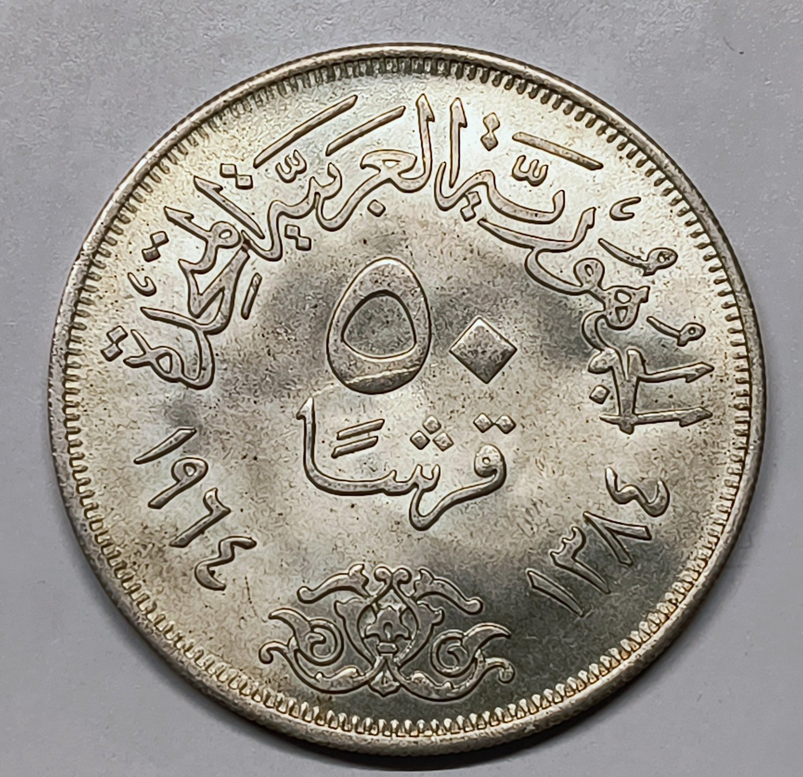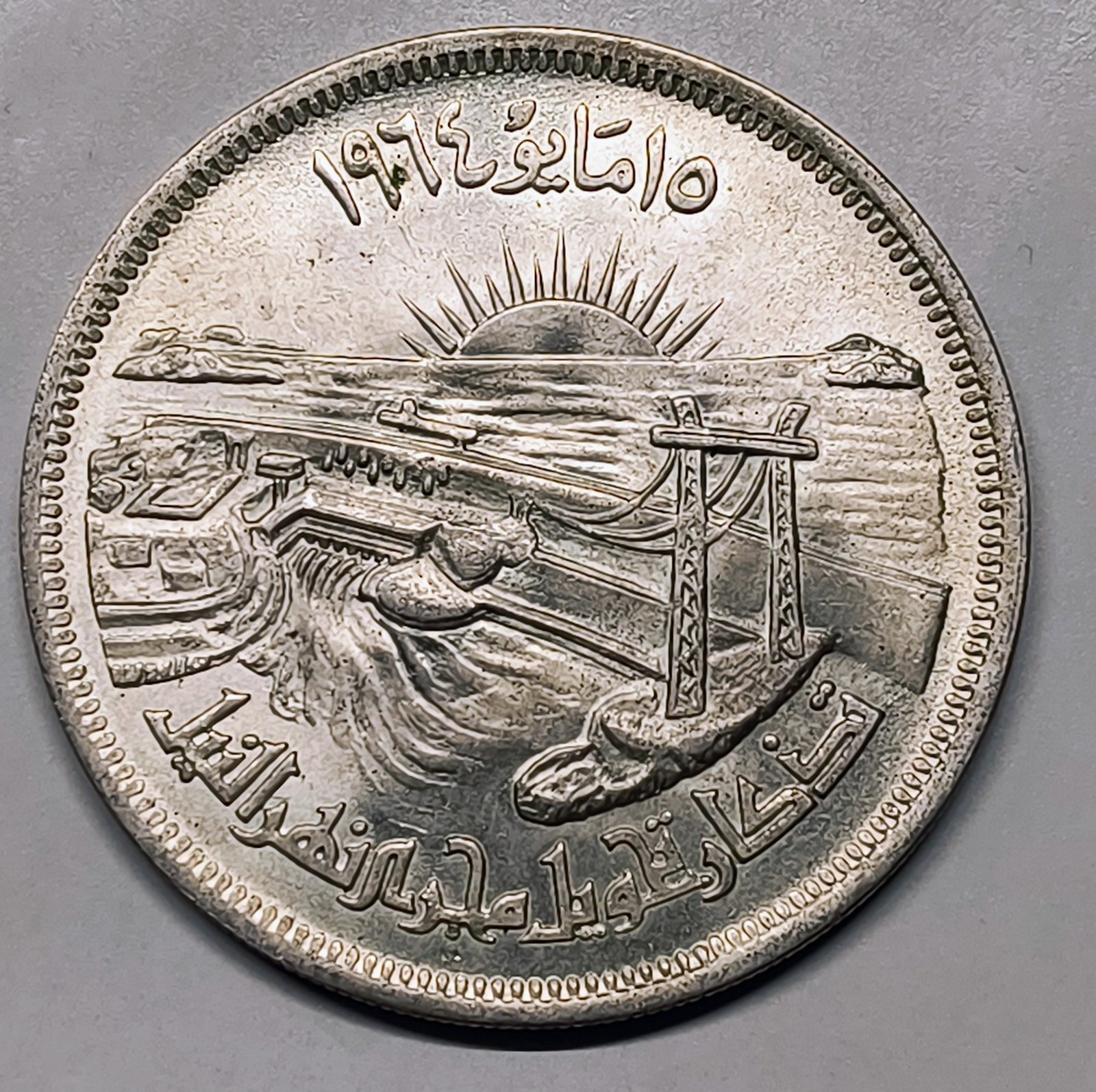 Moneda conmemorativa de 50 Piastres de la República Árabe Unida (Egipto), acuñada en 1964. Celebra el histórico desvío del Nilo por la Presa de Asuán. 20 g de plata .720. Diámetro de 40 mm. Conservación EBC.