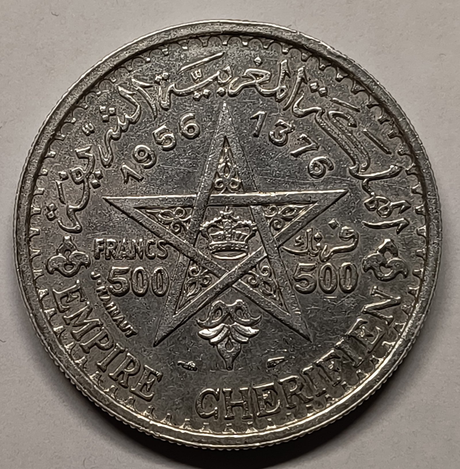 Imponente moneda de 500 Francos marroquíes, acuñada en el año 1376 de la Hégira (1956). Esta pieza representa el final de la era del franco en Marruecos y destaca por su excepcional diseño del Imperio Cherifiano.