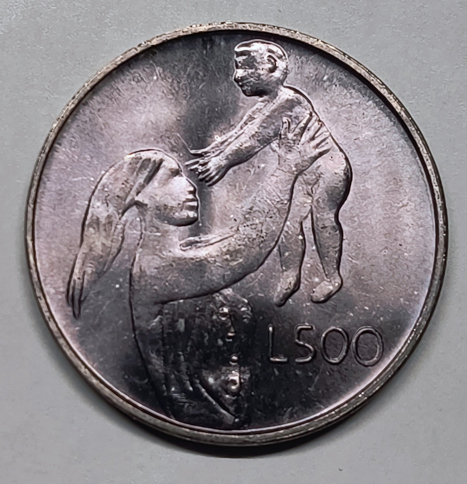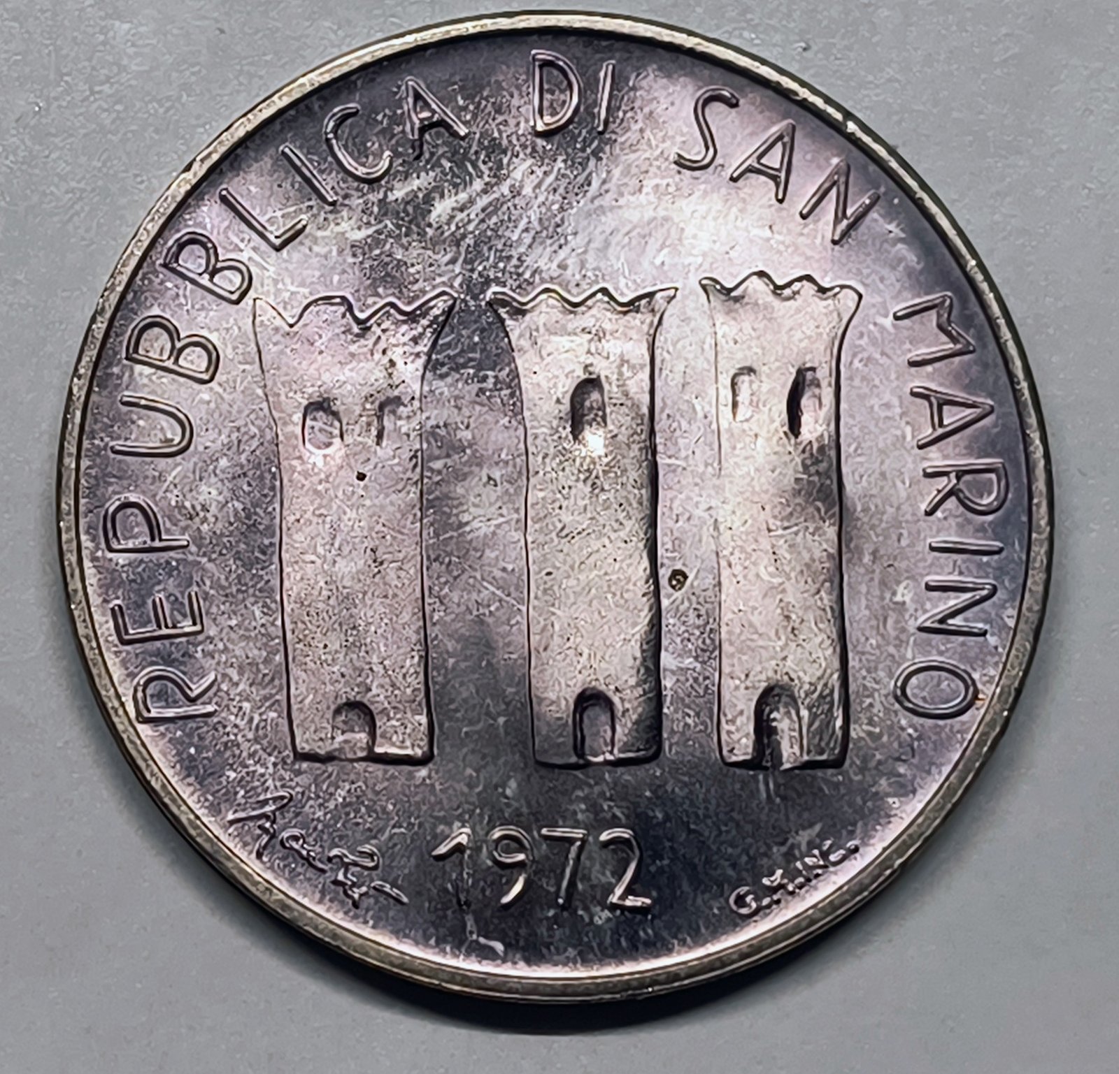 Moneda de 500 Lire de la República de San Marino, año 1972. Acuñada en plata 0,835 con un peso de 11 g. Presenta una espectacular pátina rojiza natural. Diseño de Guerrino Mattia Fabbri. Estado EBC+. Un clásico de la numismática europea moderna.