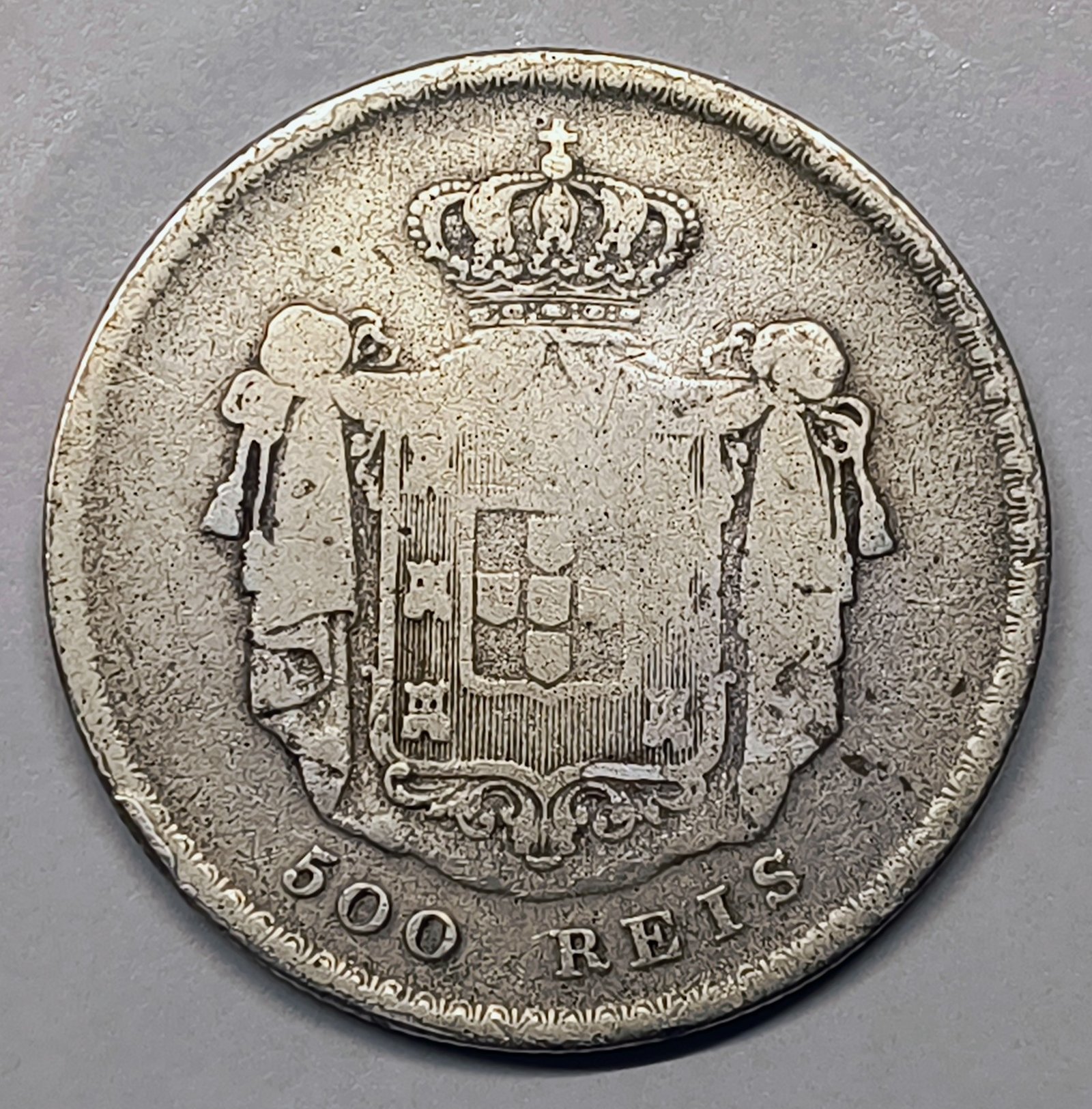 Moneda de 500 Réis del Reino de Portugal, año 1858. Acuñada en plata de alta ley (.917) con un peso real de 12,32 g. Retrato de Pedro V. Estado BC+. Una pieza histórica de mediados del siglo XIX.