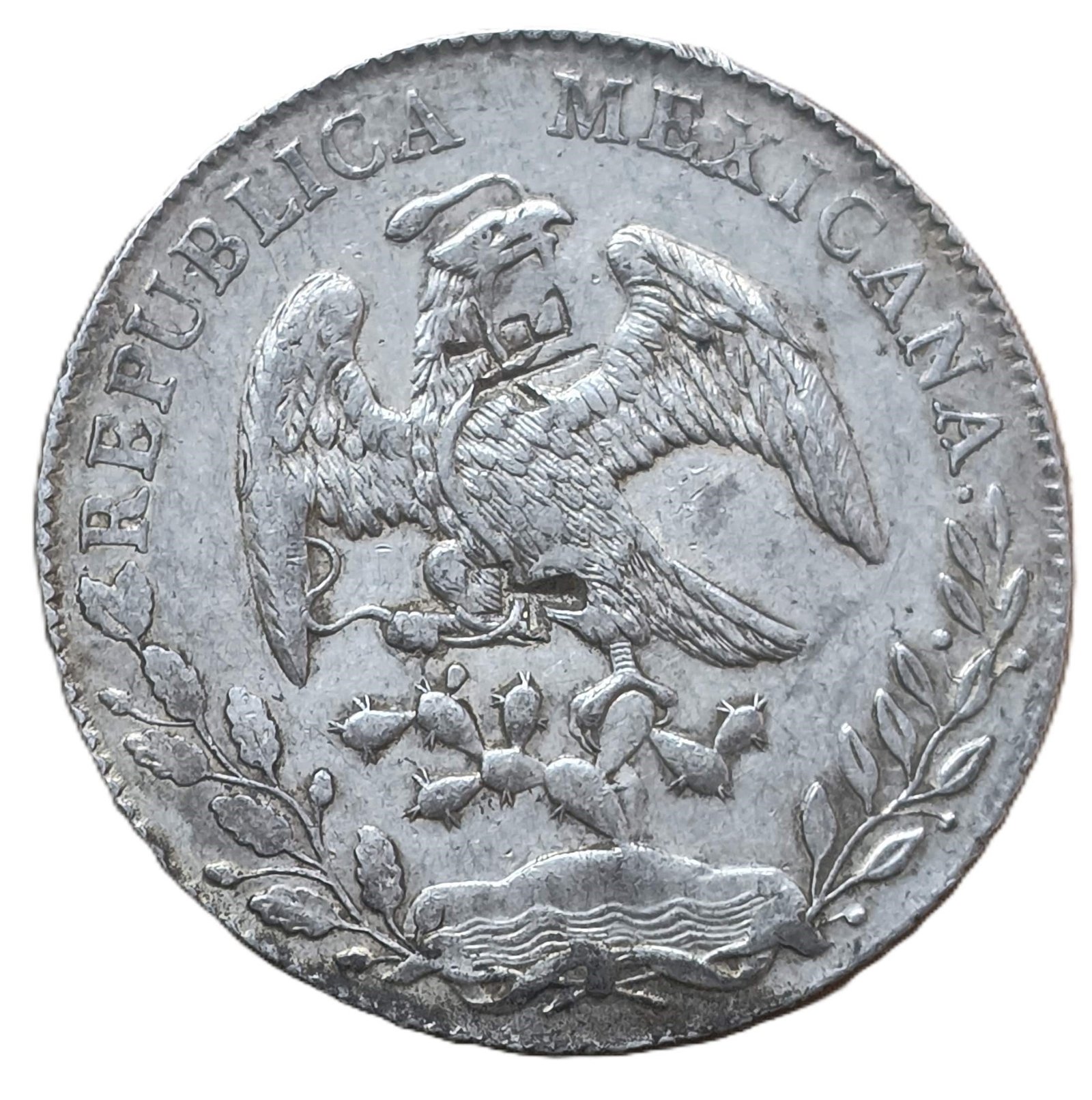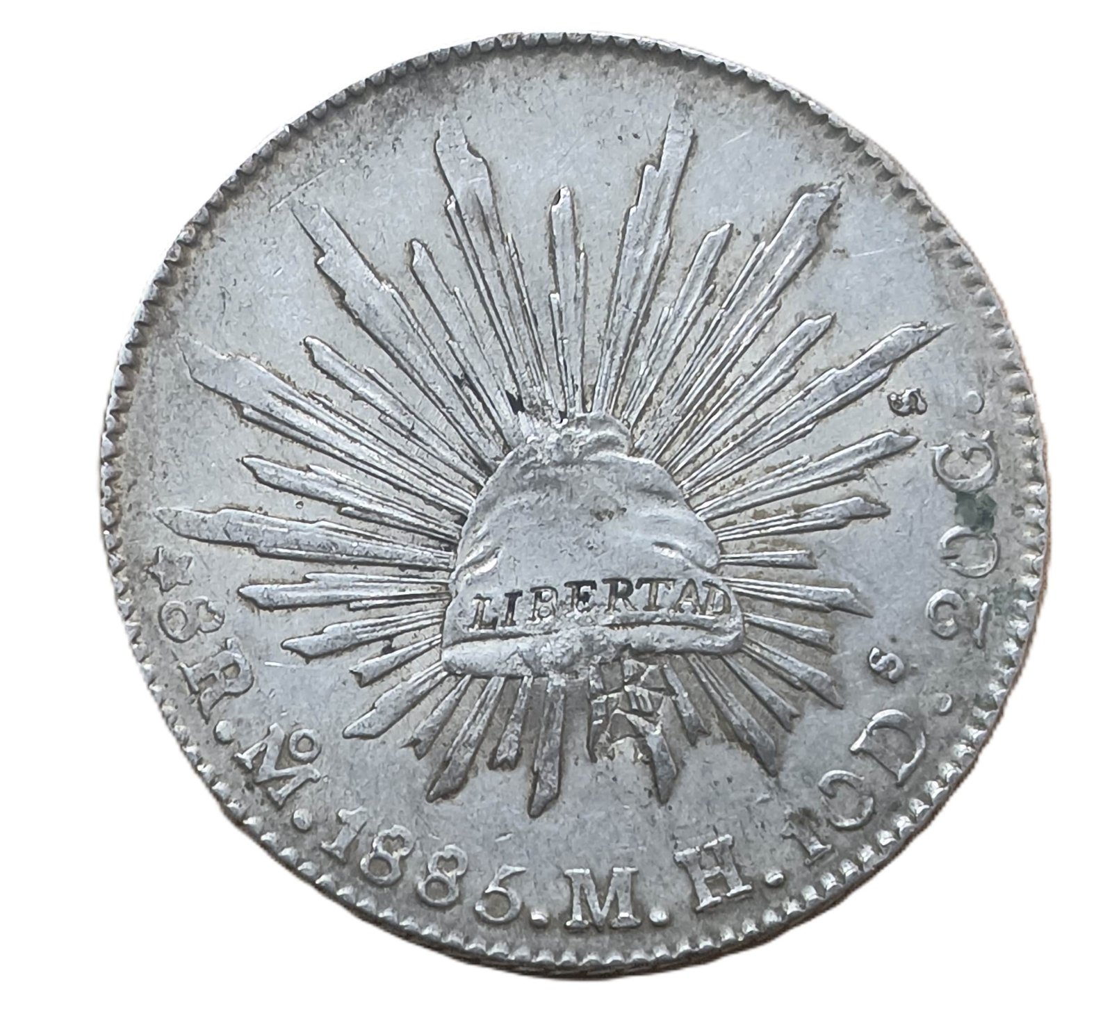 8 reales 1885 de México con ceca Mo y ensayador MH en plata 0,903. Pieza en excelente estado (AU), ideal para coleccionistas de moneda mexicana.