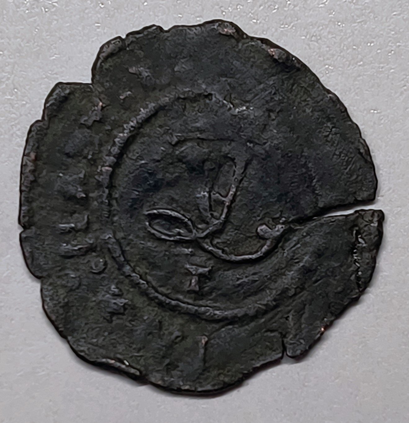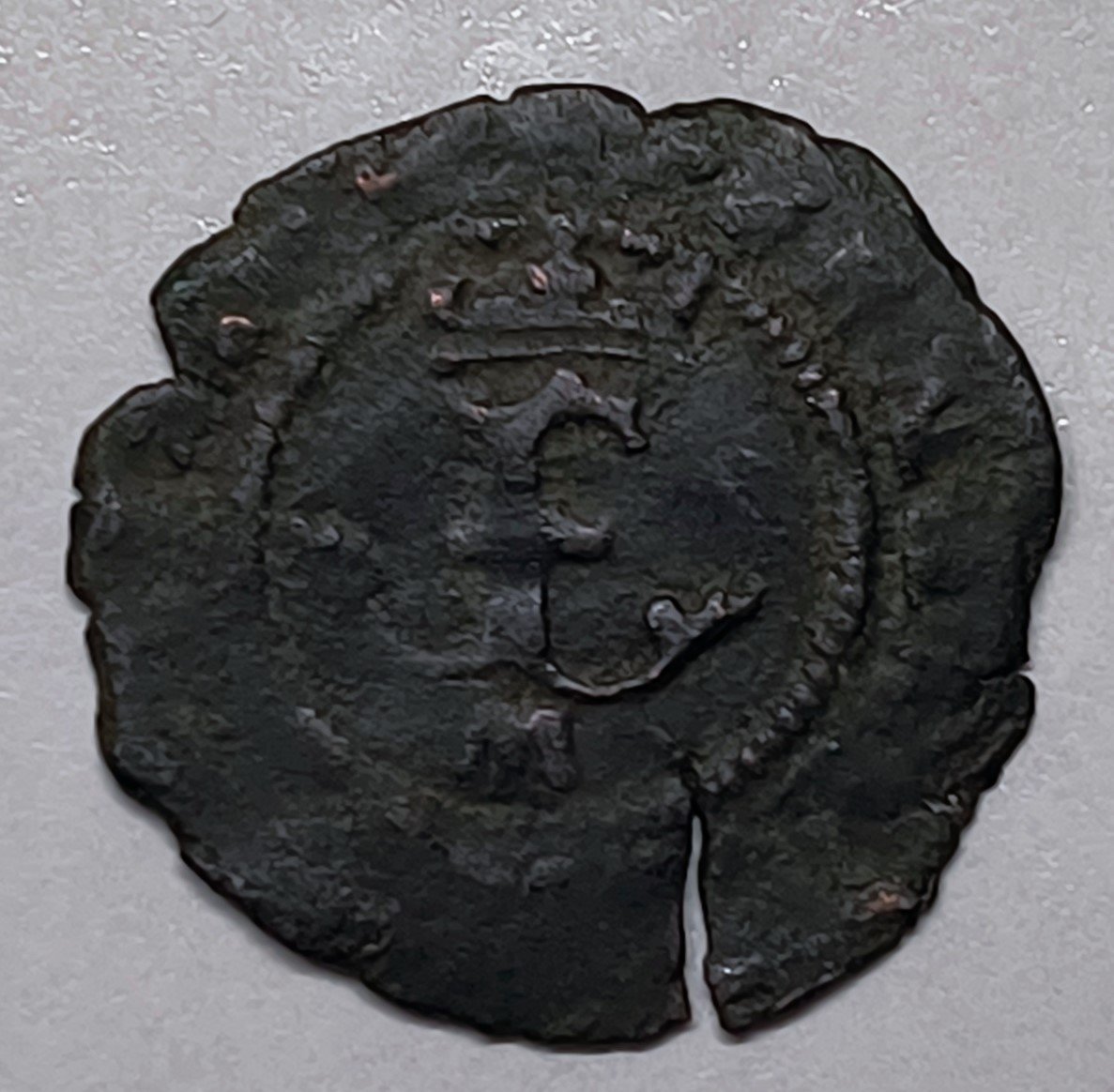 Catalogada como Calicó 2429, esta moneda presenta la sigla «M» correspondiente al ensayador. A pesar de una ligera oxidación limpiada y una grieta natural de cospel, la pieza conserva una legibilidad notable en sus motivos centrales, calificándose como Casi BC+. Con un peso de 0,89 g, es un ejemplar honesto y auténtico de la moneda fraccionaria que circuló durante el Descubrimiento de América.
