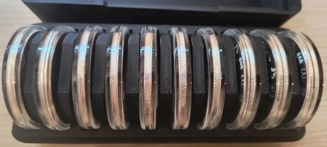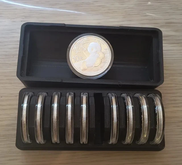 Caja para guardar pandas o cualquier moneda con capsula cuyo grosos no supere los 8mm (tipo genérico moderno), es anti golpes y sin espacio para moverse entre los huecos. La caja se puede personalizar con letreros o hacer de varios colores (según disponibilidad). Las cápsulas no se entregan, pues es una imagen de ejemplo de como se queda con 10 pandas