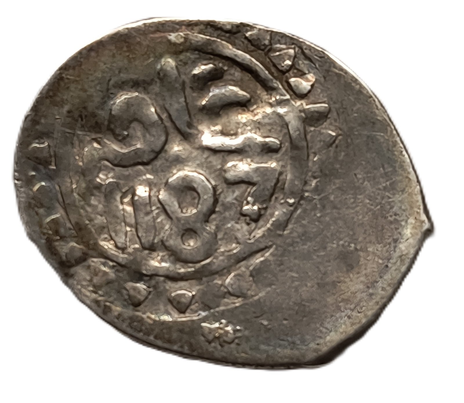 Dirham 1187 del califa Mohamed III, plata 2,83 g, leyendas cúficas bien conservadas, conservación XF. Moneda del Imperio almohade, ideal para colecciones de monedas islámicas medievales o series de califatos.