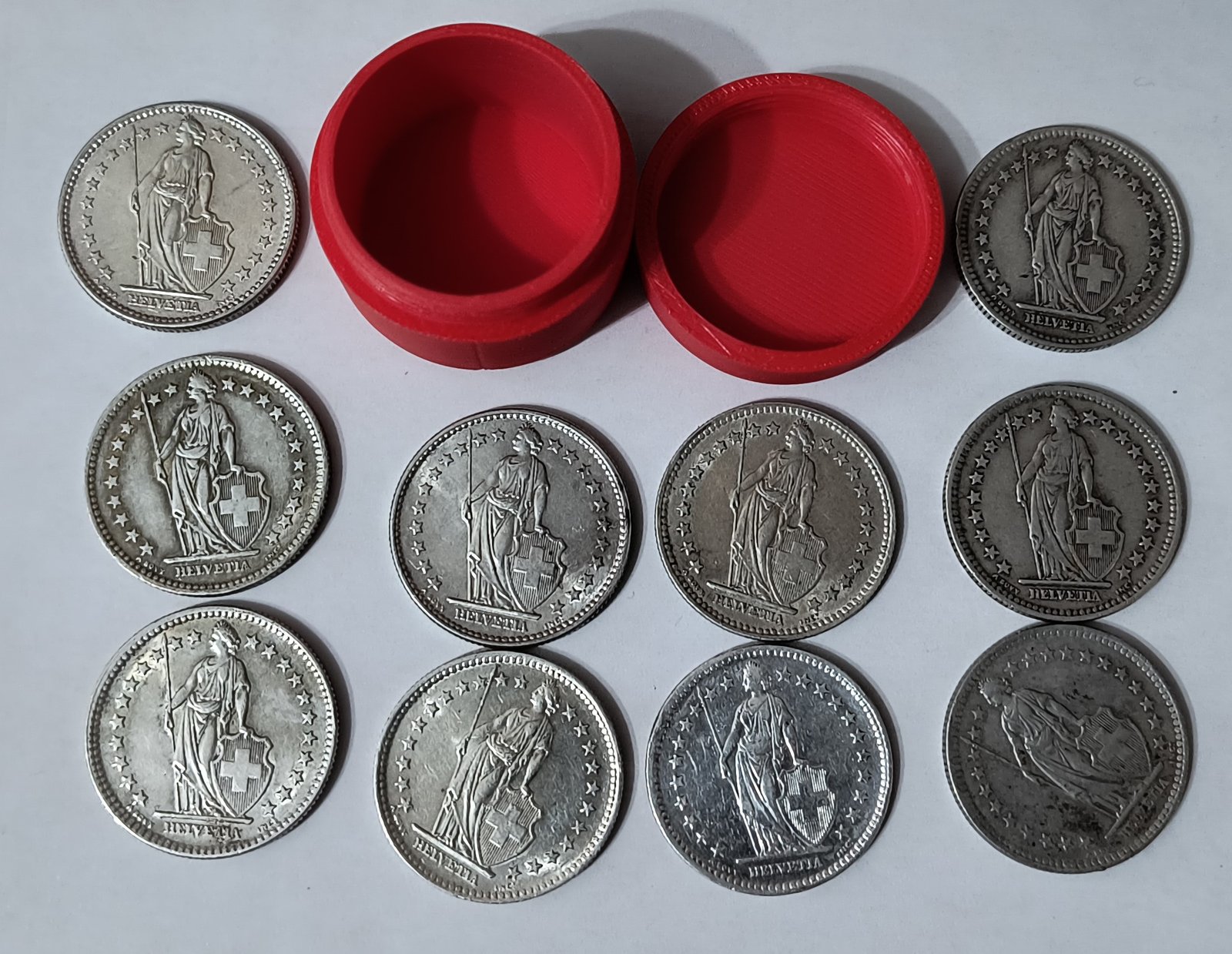 Lote 10 Monedas 2 Francos Suizos (1943-1965) – Plata .835 – Con Tubo