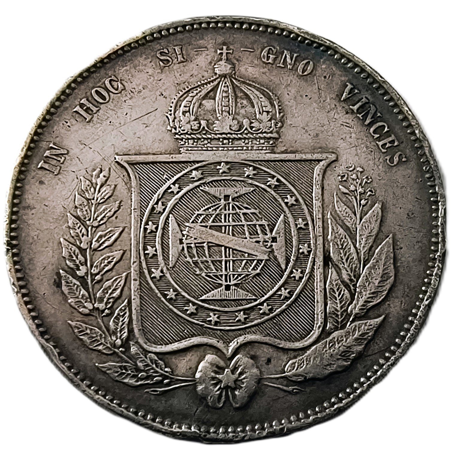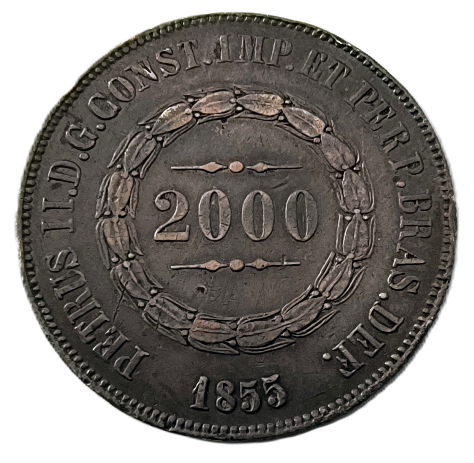 Moneda de 2000 Reis 1855 de Brasil, acuñada en plata 0,917, con un peso de 25,42 g. Estado de conservación MBC.