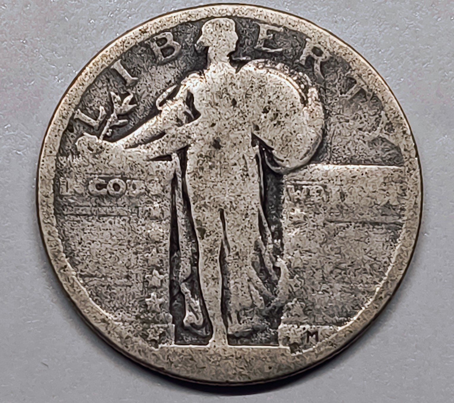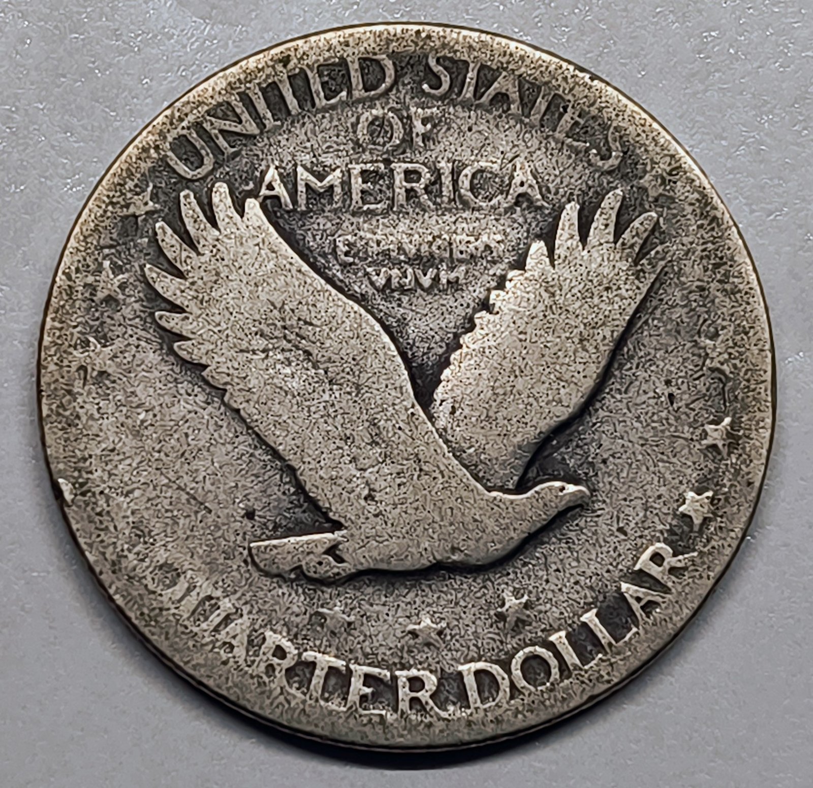 El Standing Liberty Quarter es una de las monedas más bellas de la historia de los Estados Unidos. Diseñada por Hermon A. MacNeil, fue acuñada desde 1916 hasta 1930. Esta pieza corresponde a la variante «Stars Below Eagle», acuñada entre 1917 y 1924, identificable por las estrellas situadas bajo el águila en el reverso.